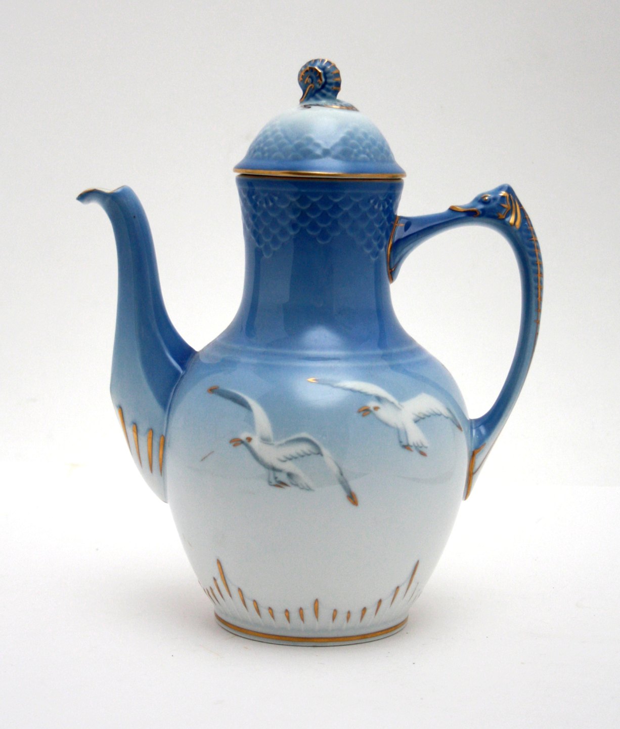 Bing & Grøndahl, Mågestel med guld. Kaffekande, dek. nr. 91A, højde 24,5 cm. II. sortering. Pris: SOLGT (Foto 1) Kaffekande, dek. nr. 91A med buttet korpus, højde 25,5 cm. I og II. sortering. Pris: 275 kr. st. Lager: 2 (Foto 2)