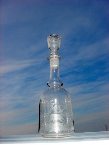 Karaffel med hjortemotiv på korpus og prop.