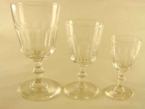 Christian d. VIII glas med kugleslebet bund. Rødvinsglas, højde 15 cm. Pris: SOLGT Hvidvinglas, højde 12 cm. Pris: SOLGT Portvinglas, højde 10 cm. Pris: SOLGT Snaps, højde 8,5 cm. Pris: SOLGT