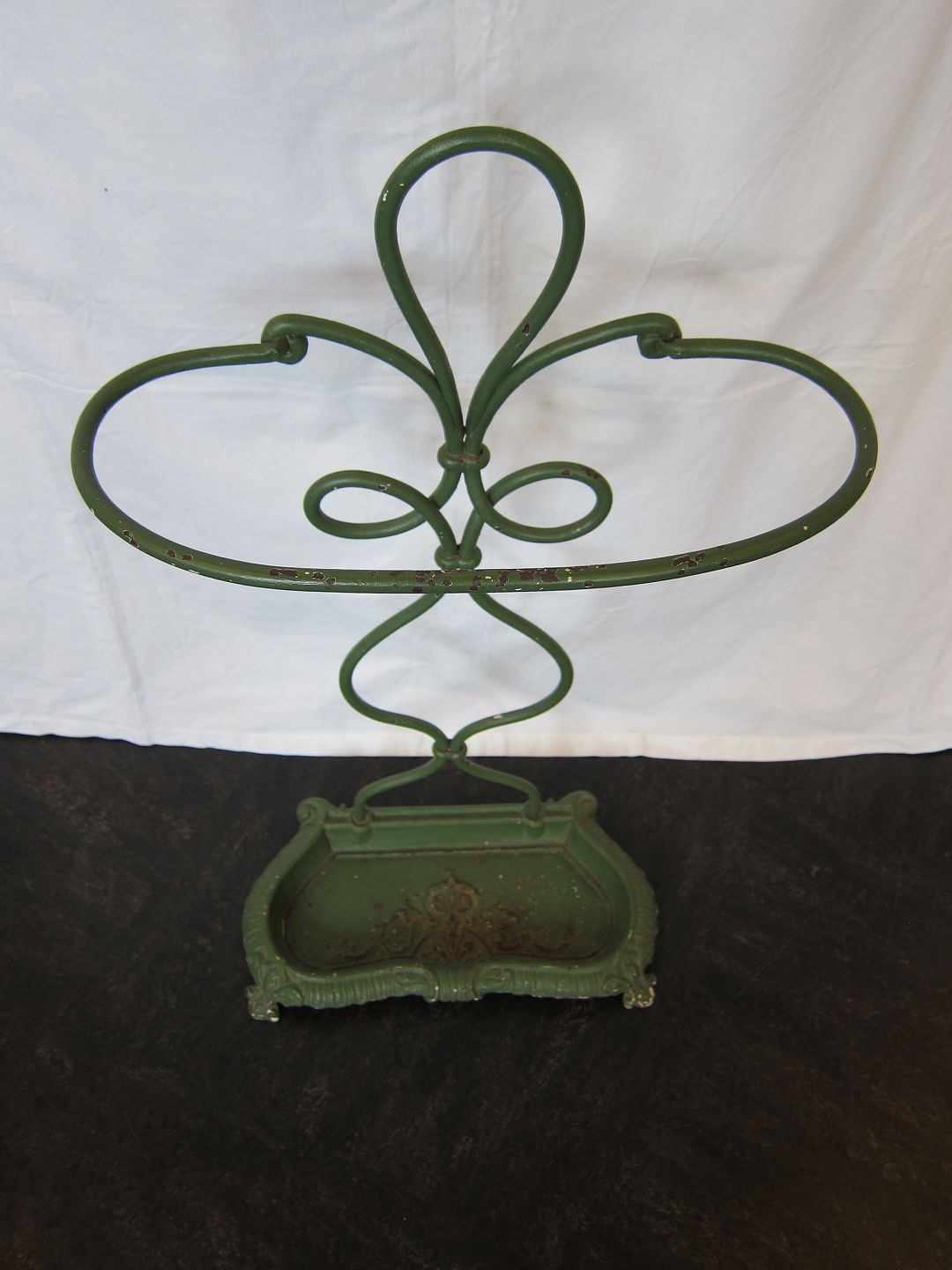 Beautiful old umbrella stand made of green painted iron with a beautiful shape and decorations