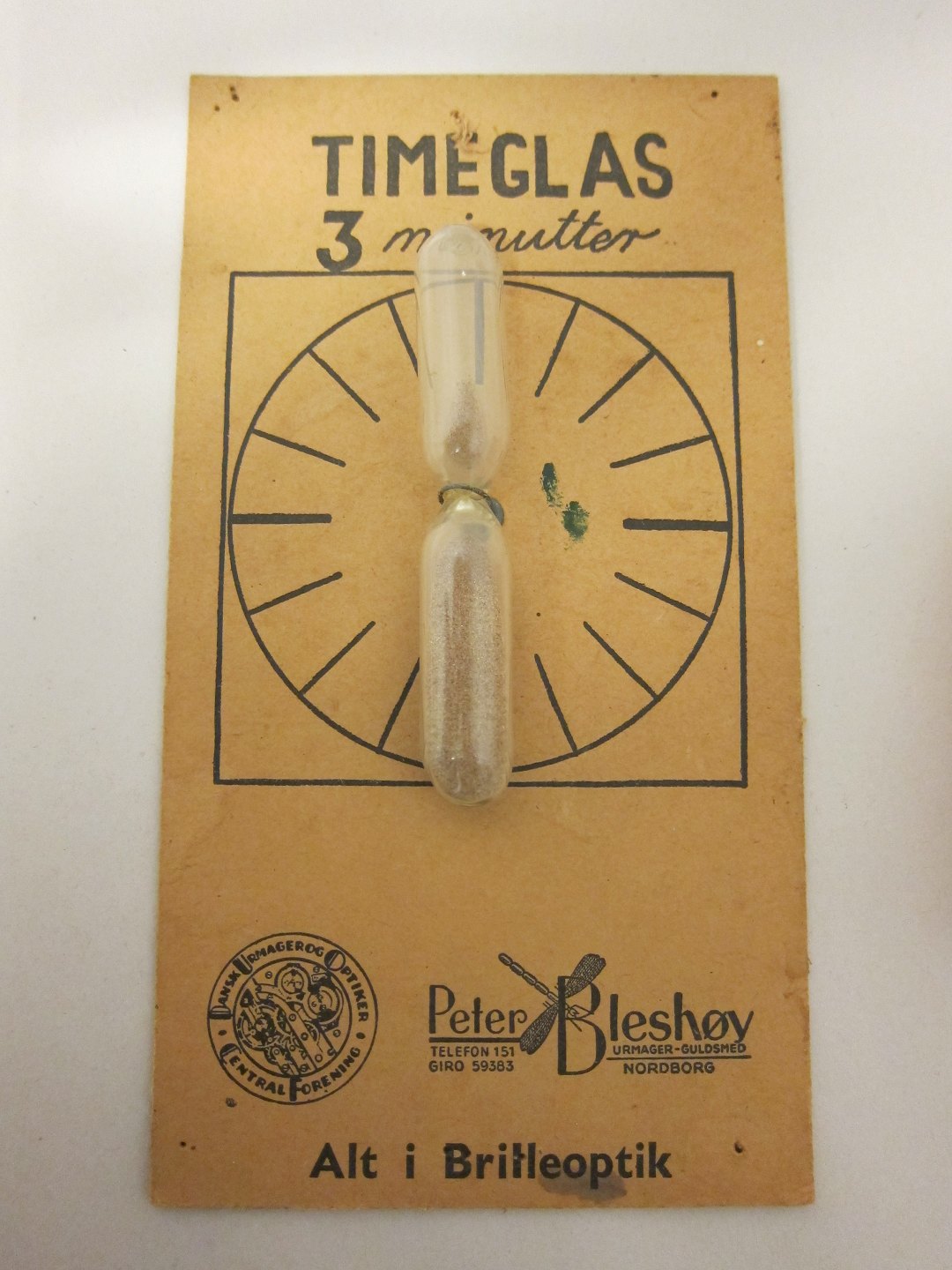 Timeglas pap: 18cm x 10cm, Timeglasset: 8,5cm (Solgt)
