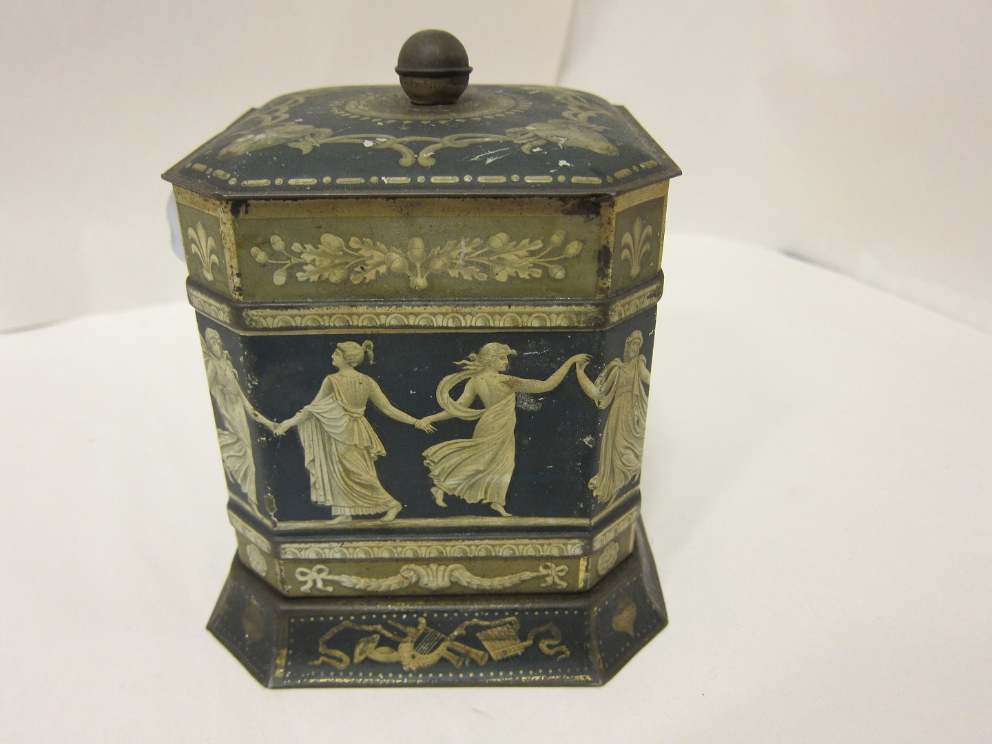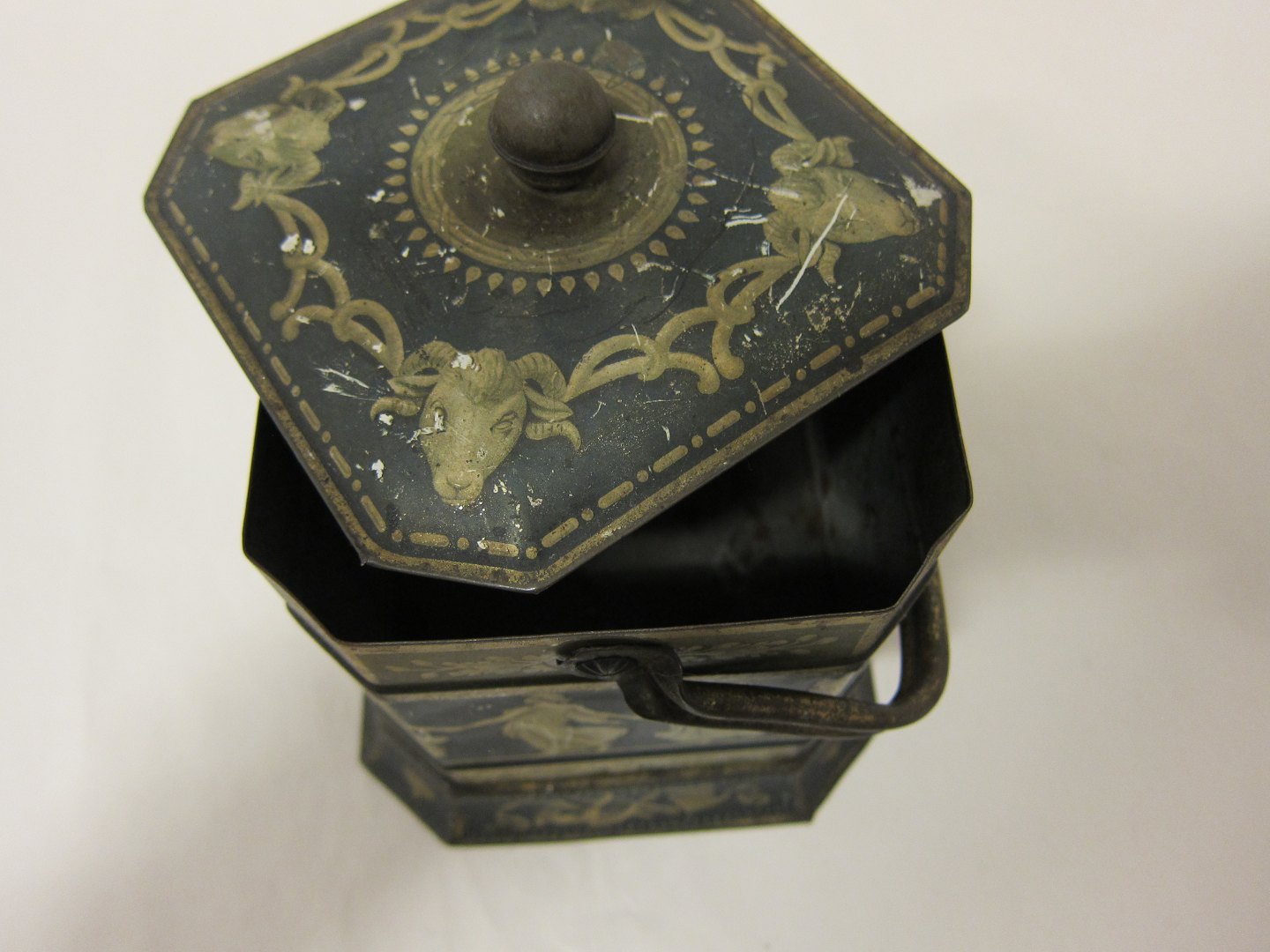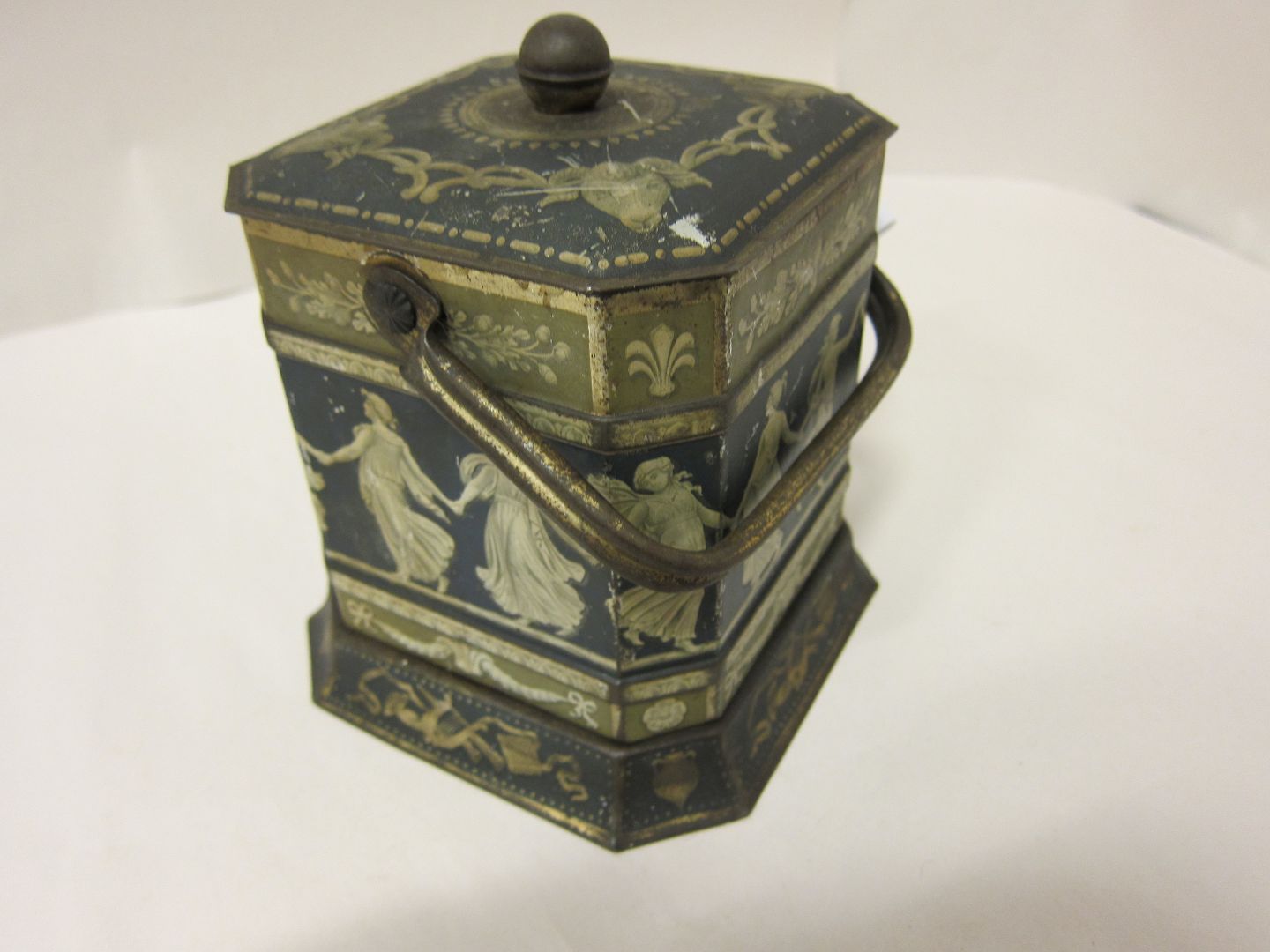 Biscuit-box/Can, made of metal, with a lid and a handle 4-/8-edged can H: 16,5cm W: 12cm Condition good compared with the age Articleno.: 51212