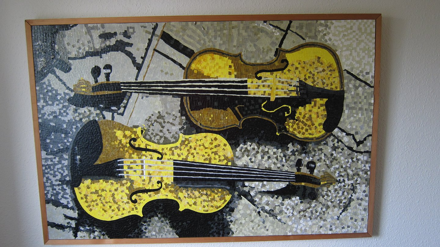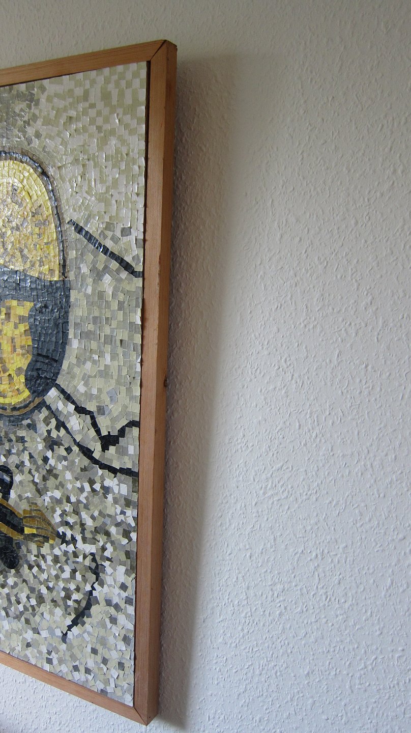 This unique decoration is constructed of many tiny pieces of paper placed at a wooden plate