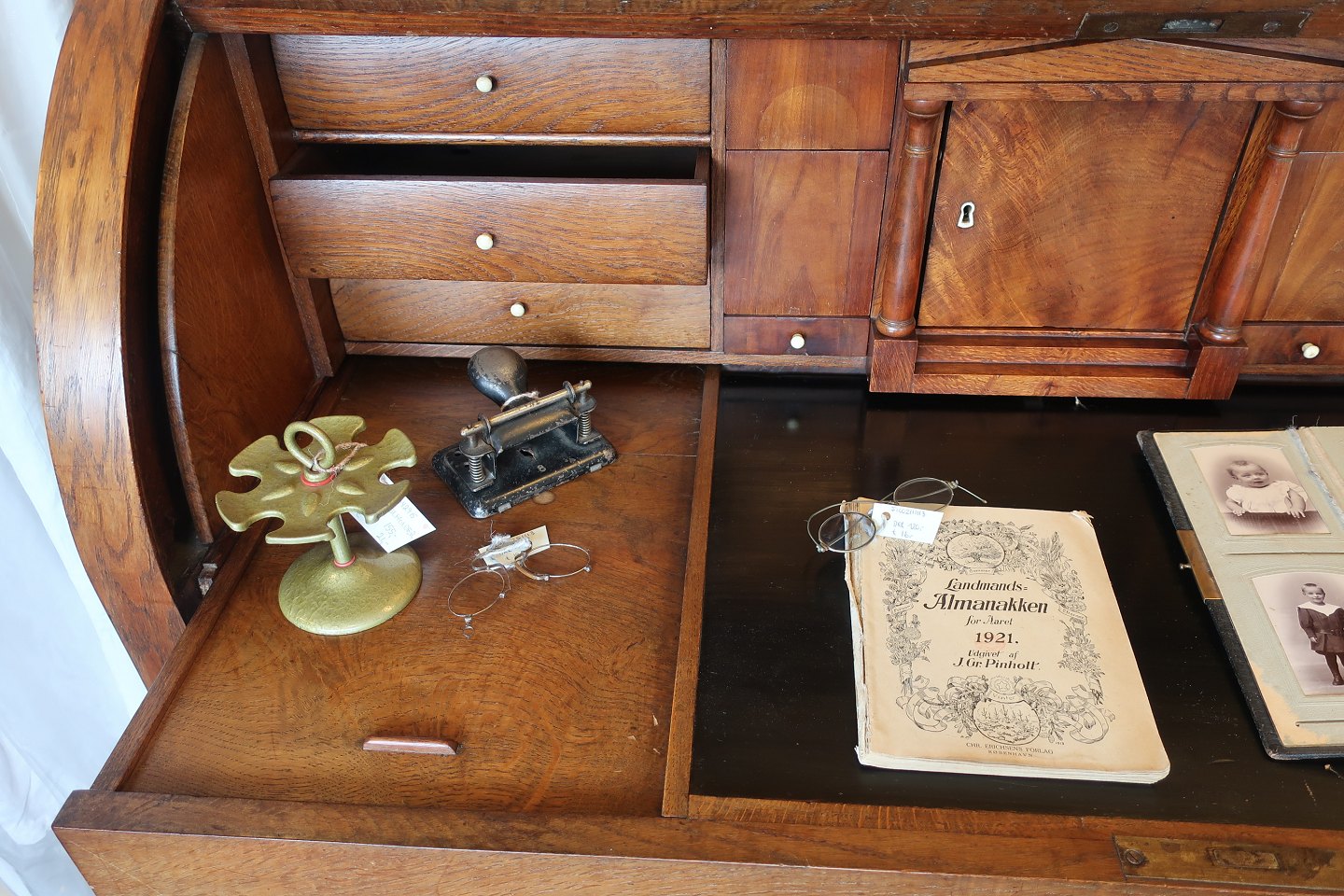 This antique writing bureau from Sønderjylland (Southern Jutland) is with a cylinderformed leaf