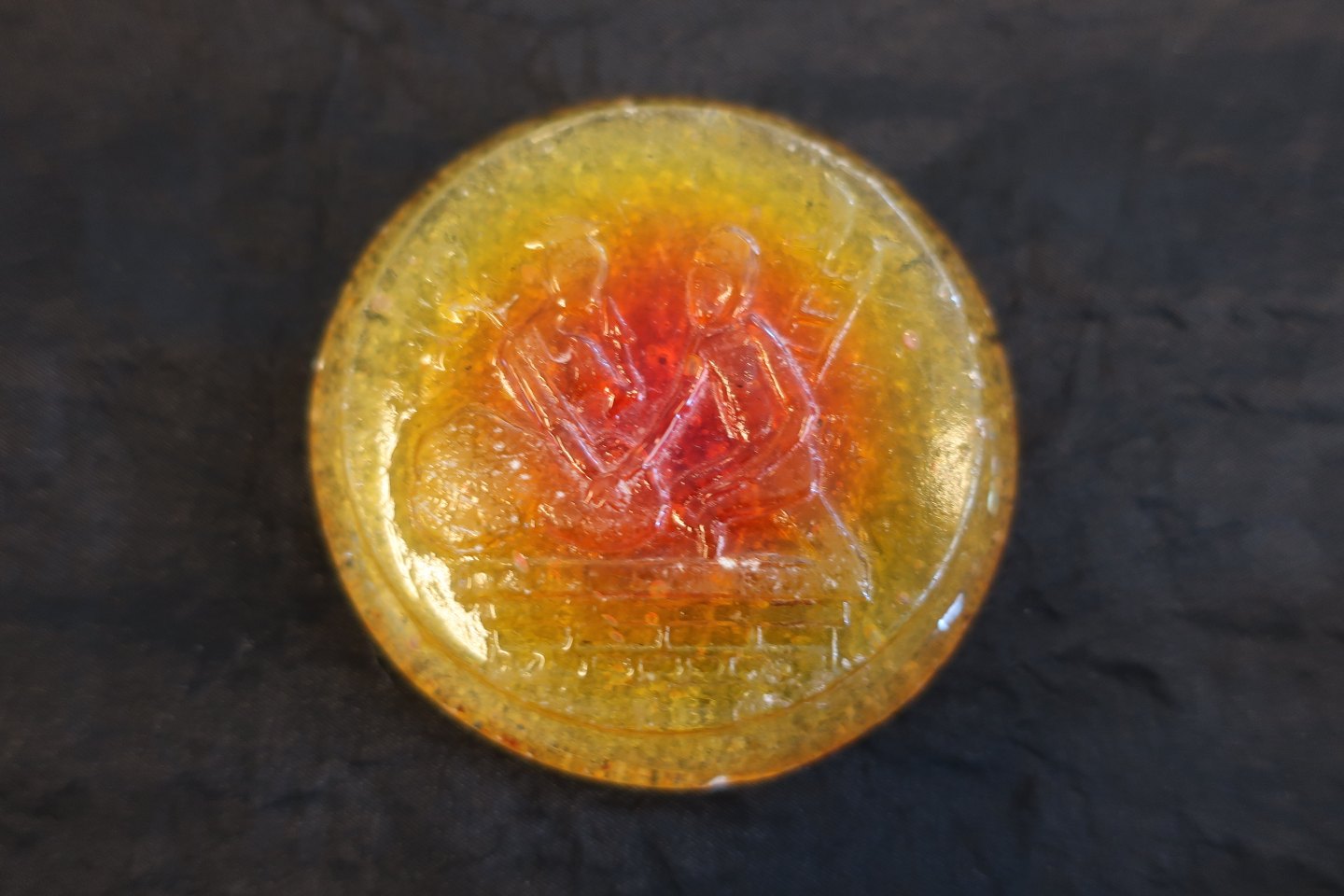Hopscotch made of "clear" glass with a beautiful motif "Hyrdinden og Skorstensfejeren" (The shepherdess and the chimney sweep) by H.C. Andersen