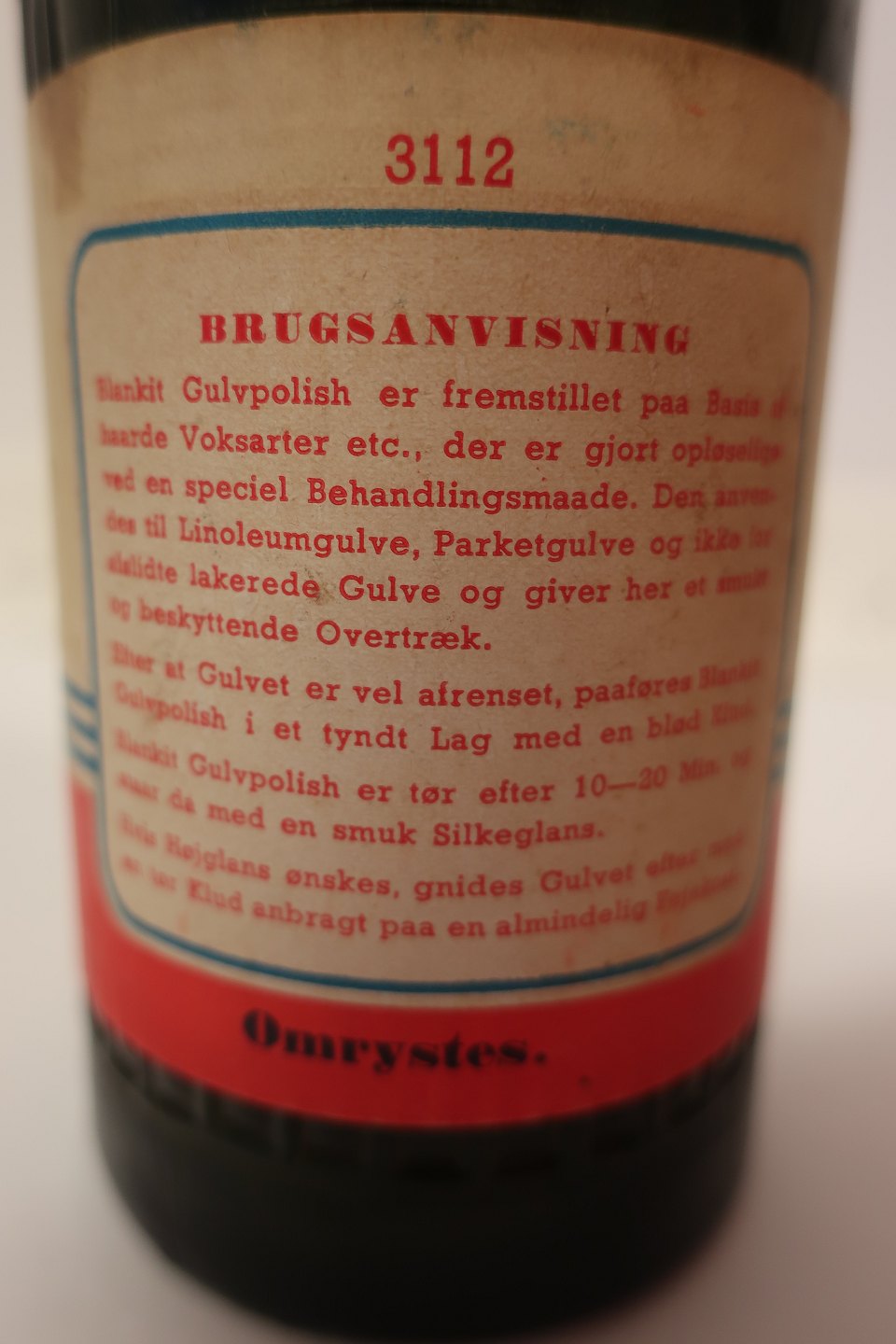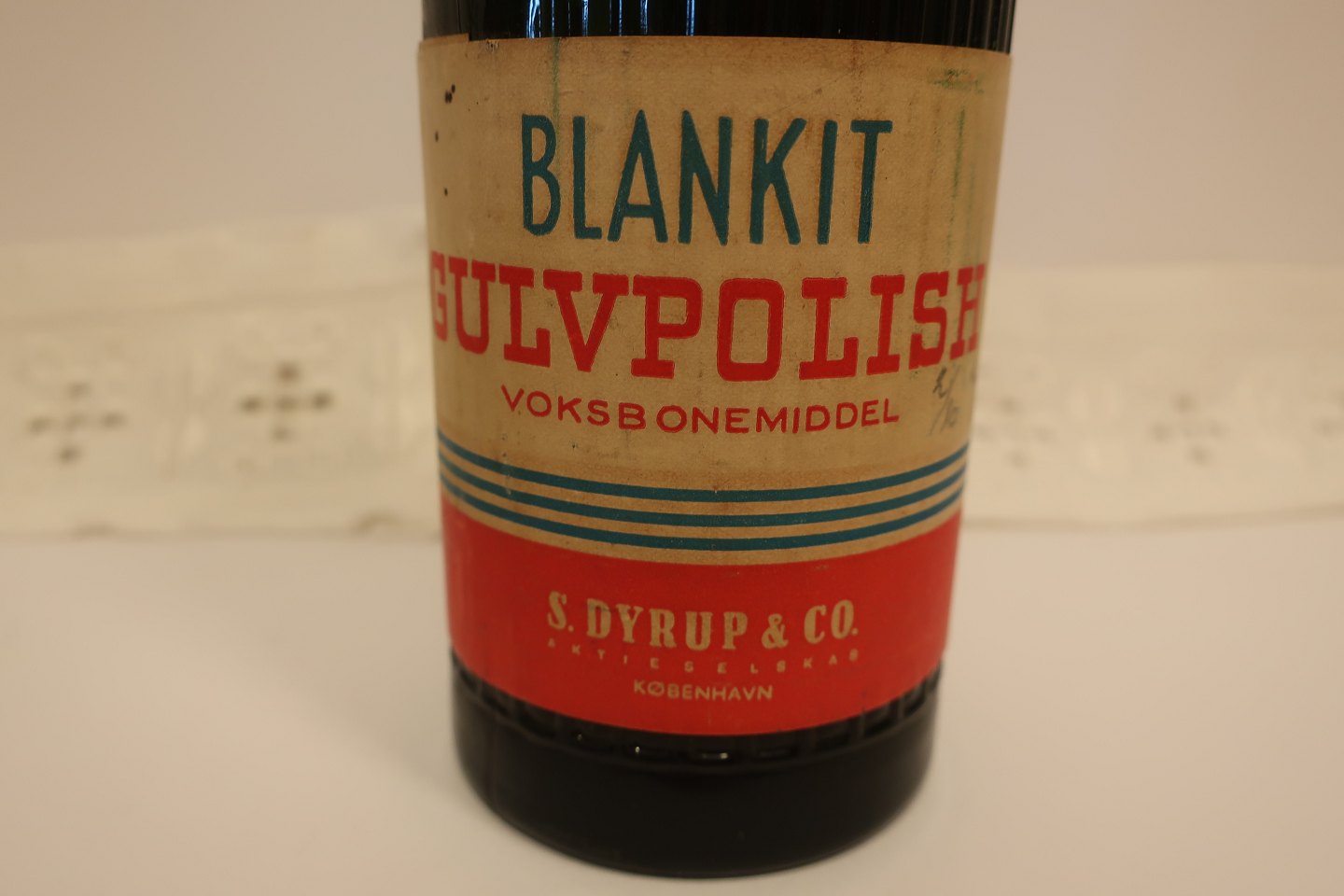Gammel original flaske med etiketten "Blankit Gulvpolish - Voksbonemiddel"