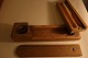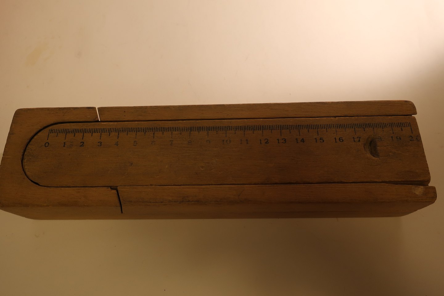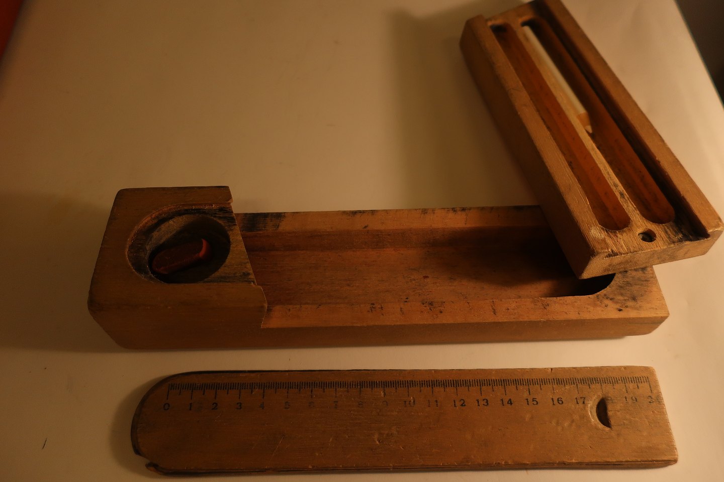An old pencil box with decorations cut in the wood and flowerdecoration as well