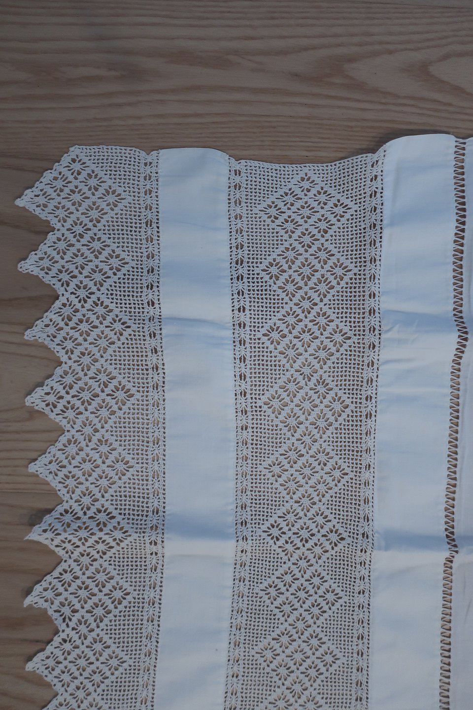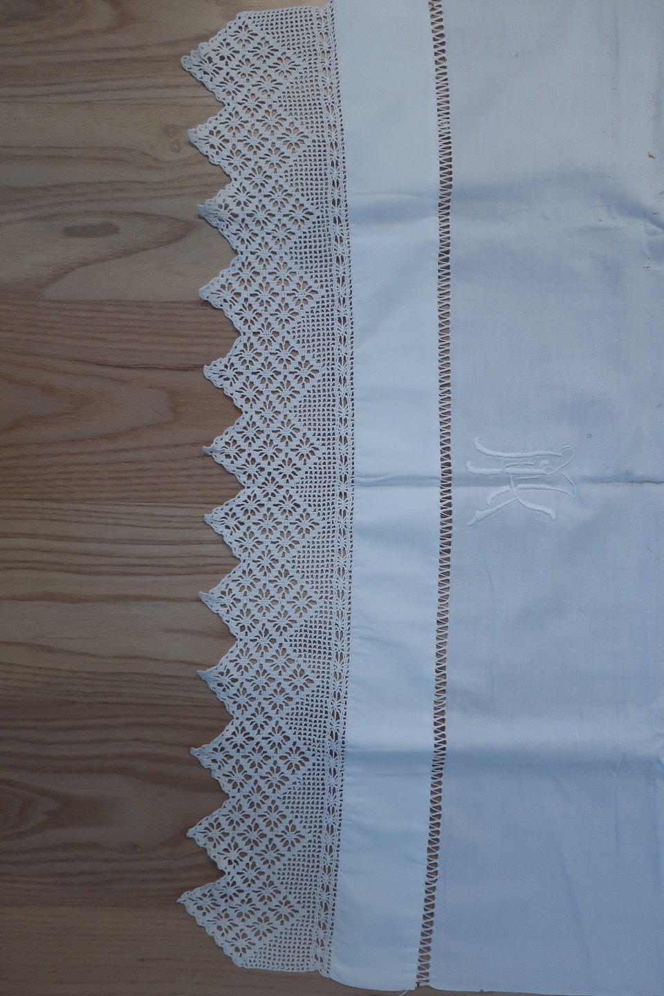 Smukt gammelt paradestykke med hvid håndhæklet bort m.m. og initialer