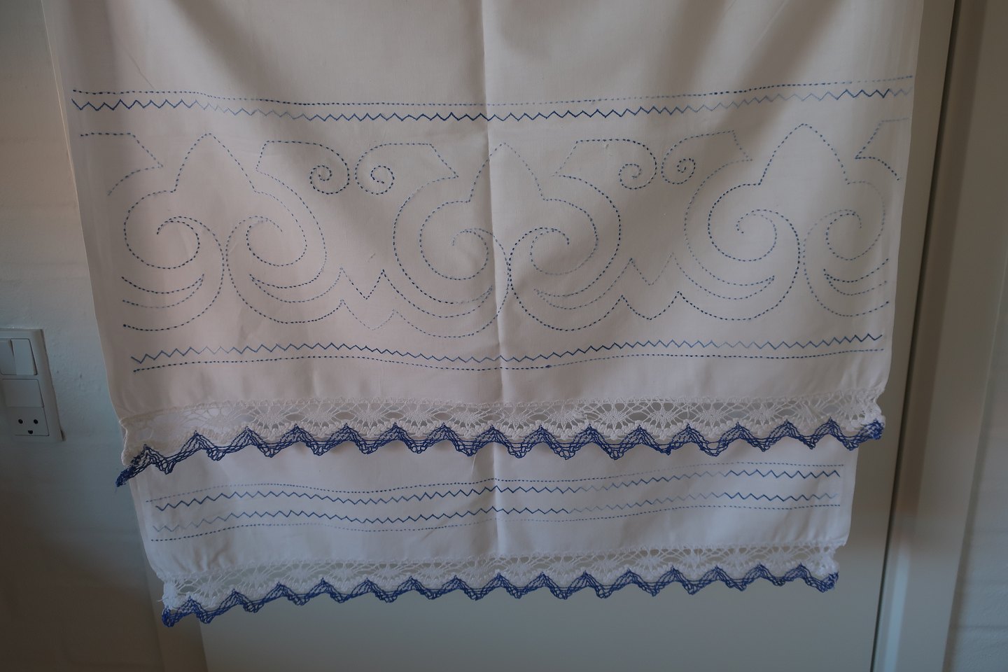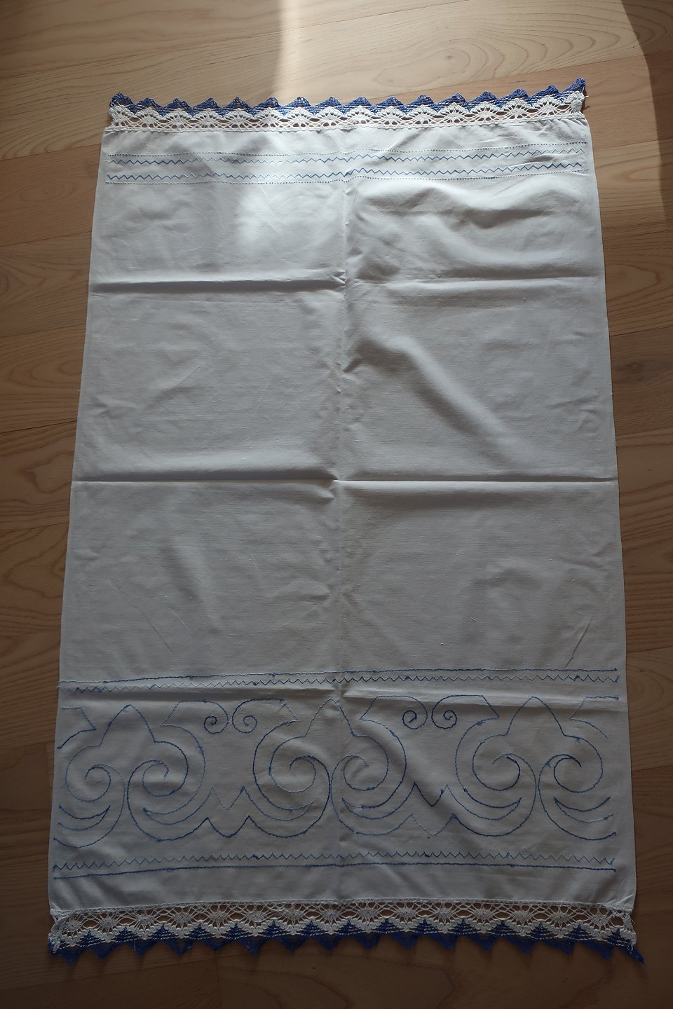 Schönes altes Paradestück mit blauer Stickerei - handgemacht