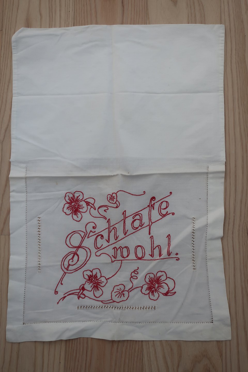 Pudevår med håndbroderet tekst: "Schlafe wohl"