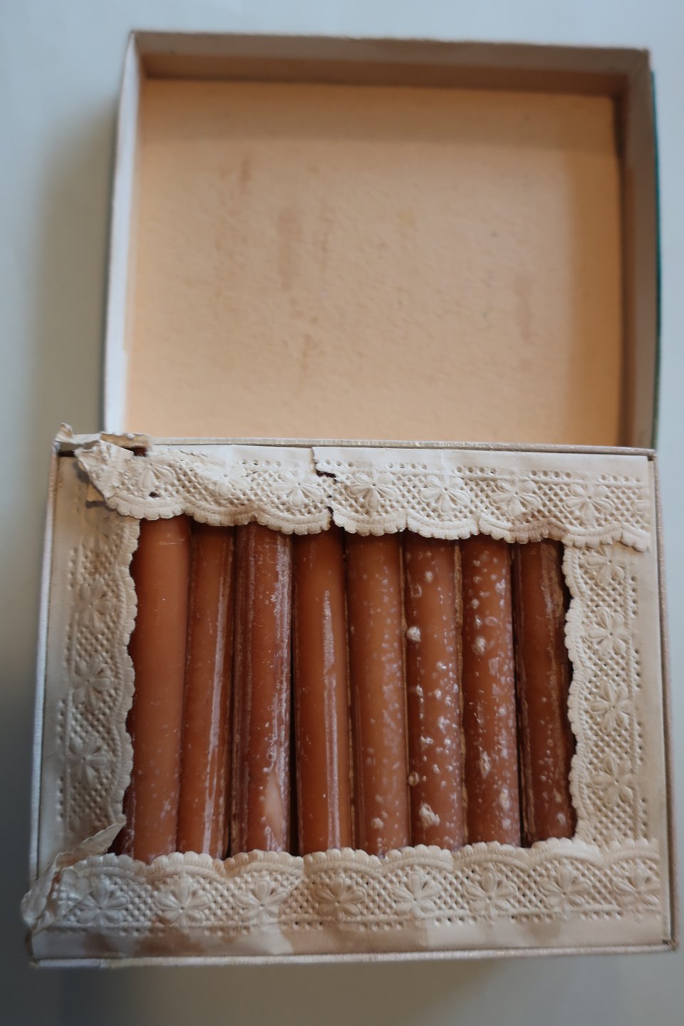 Old christmas candlelights made of stearin, - in the original box From Asp-Holmblad, Denmark Red candlelights In a good condition Articleno.: 2-51252