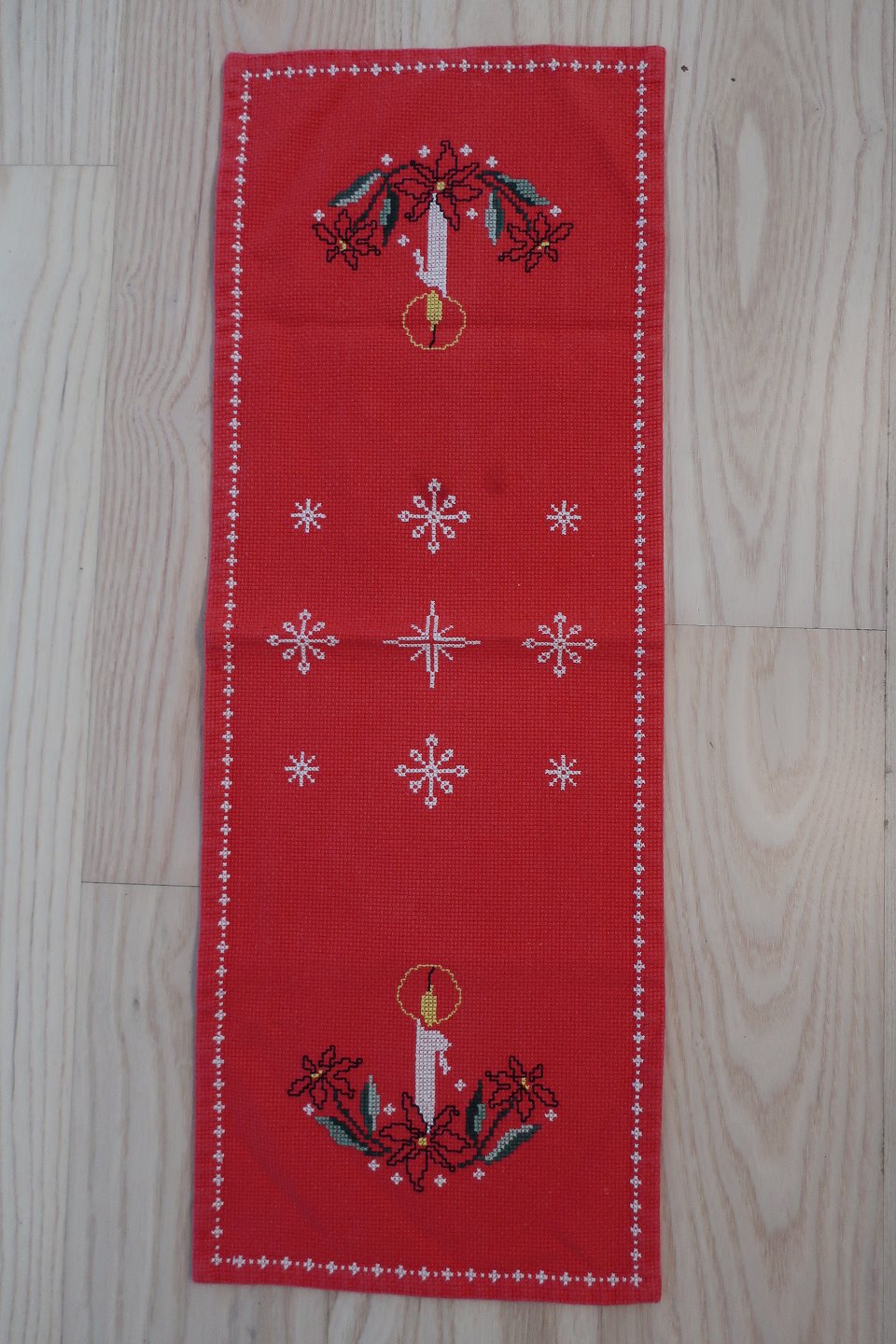 Gammel smuk jule-bordløber Håndbroderet i korssting Bringer hyggen ind i hjemmet 63cm x 23cm God stand, lille plet Varenr.: 4-312111