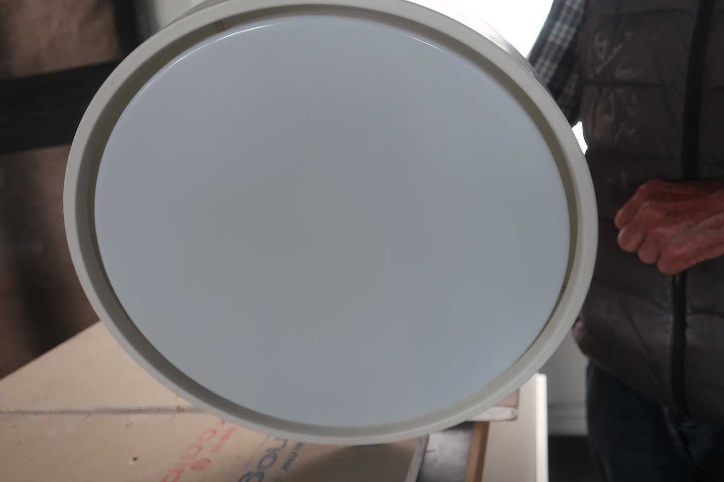 Beautiful round (glope/ dome)-shade made of white painted metal with flat undershade made of white dull plastic
