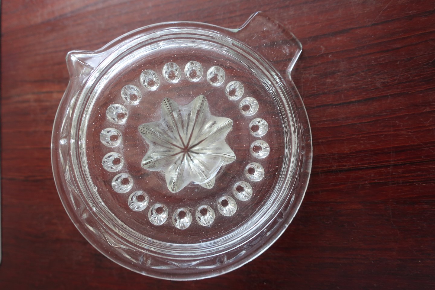 An old lemon squeezer made of glass Beautiful decorations One of the good old ones, which works good Diam.: 12,5cm In a good condition Articleno.: KM1006