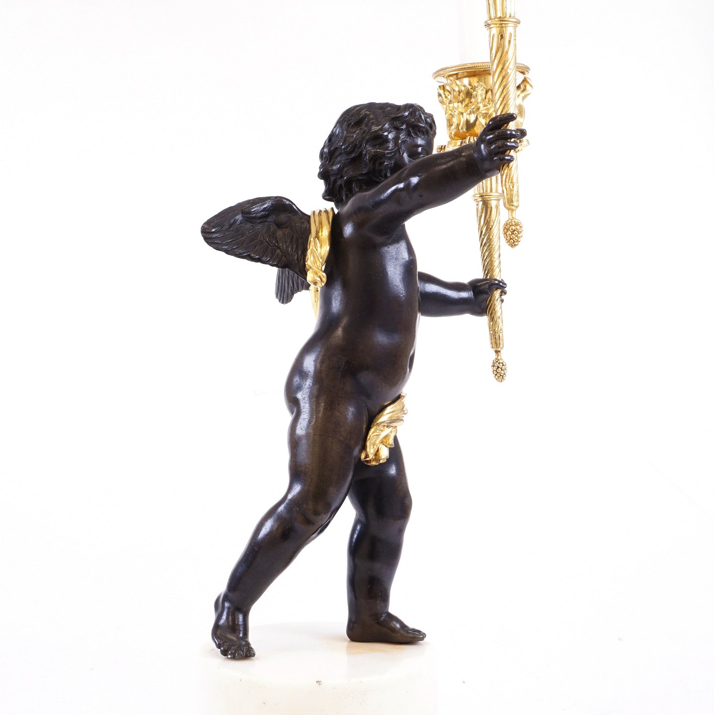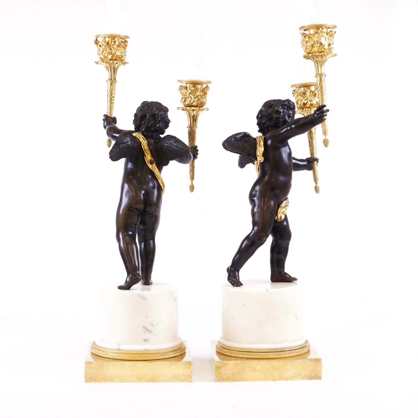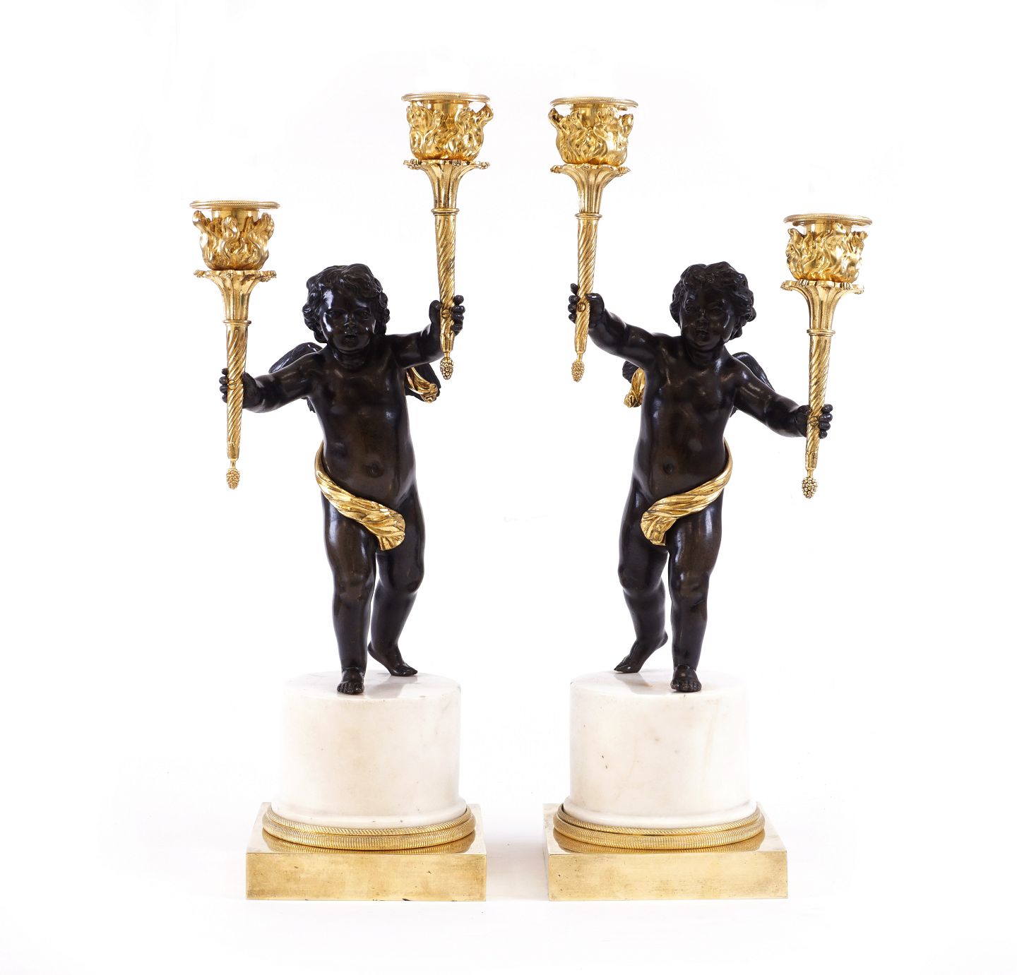 Ein Paar frühes empire Bronze Kandelaber in Form von zwei schwarzpatinierten Engeln je mit zwei Kerzenhaltern