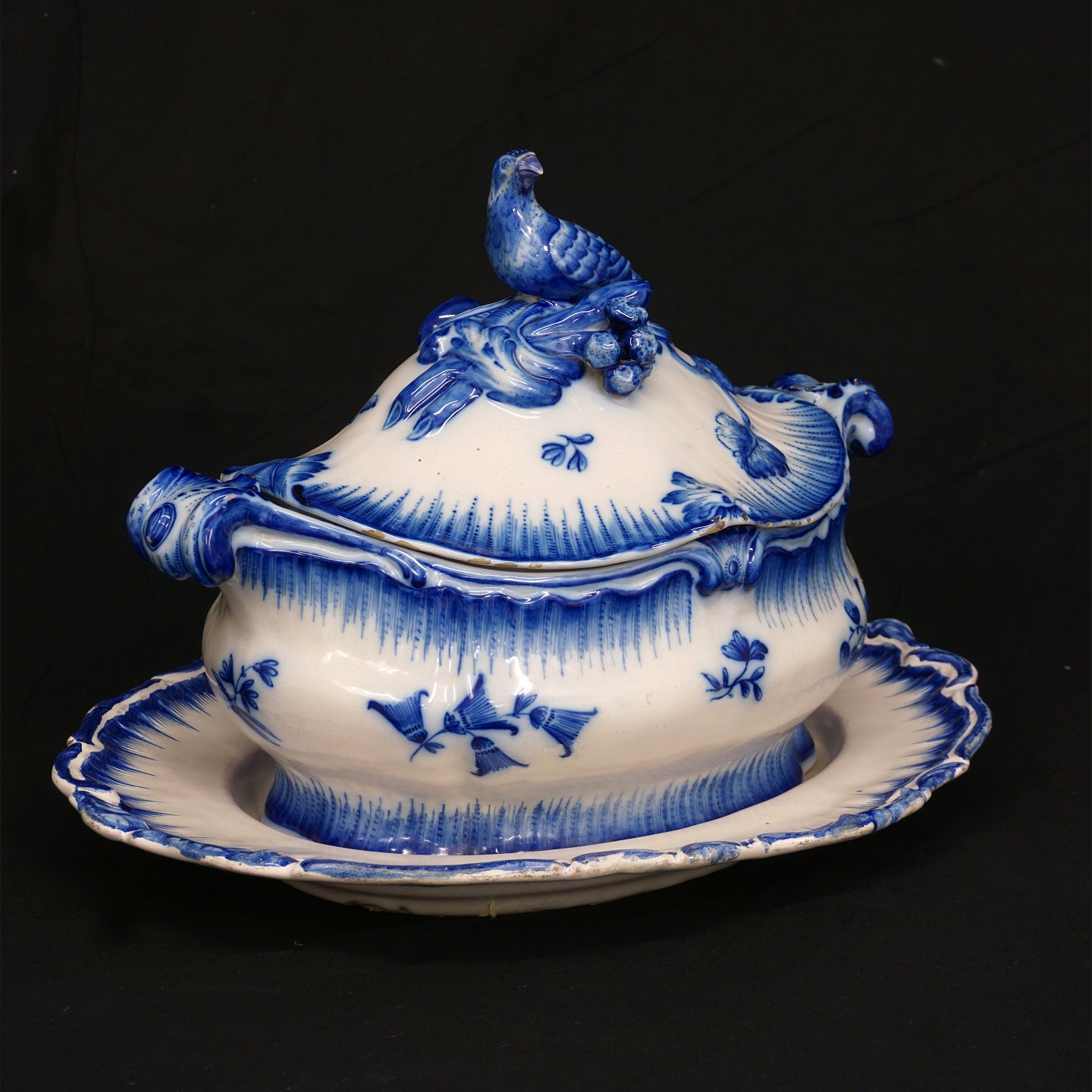 Blue decorated 18th century tureen, faience. Signed Marieberg, Sweden, 02.08.1766. H: 27cm. L: 45cm