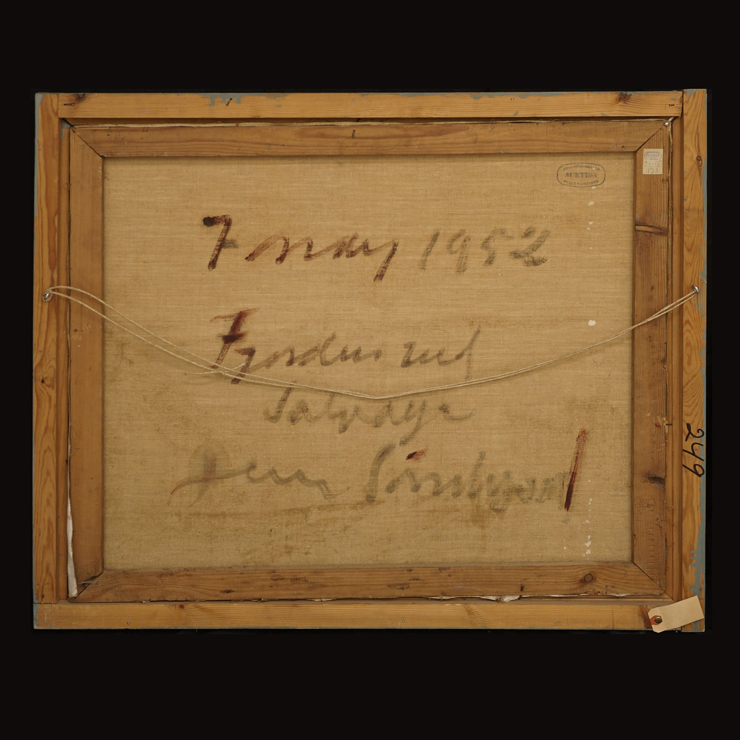 Jens Søndergaard, 1895-1957: Landscape with water, house and a person. Oil on canvas. Signed and dated 1952. Visible size: 66x79cm. With frame: 77x90cm