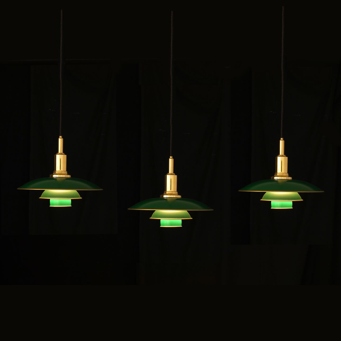 Poul Henningsen: sæt på tre 3/2 pendler i grønlakeret metal med messingmontering