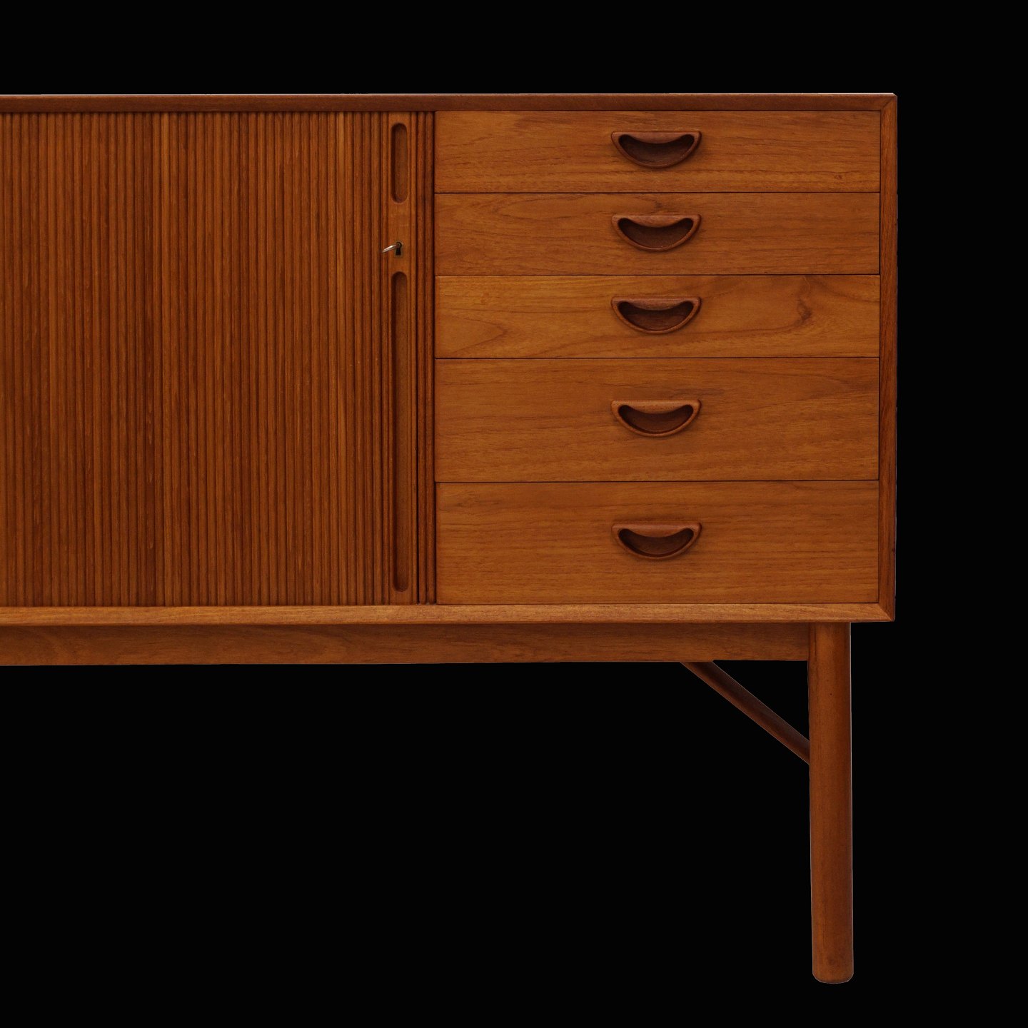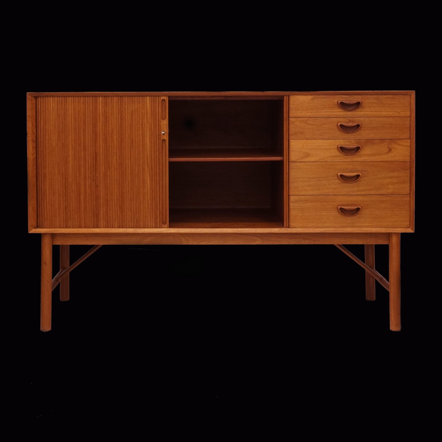 Peter Hvidt & Orla Mølgaard-Nielsen: Skænk af teaktræ. Front med fem skuffer og jalousilåge, hvorbag hylder. Design fra 1956. H: 87cm. L: 135cm. D: 48cm