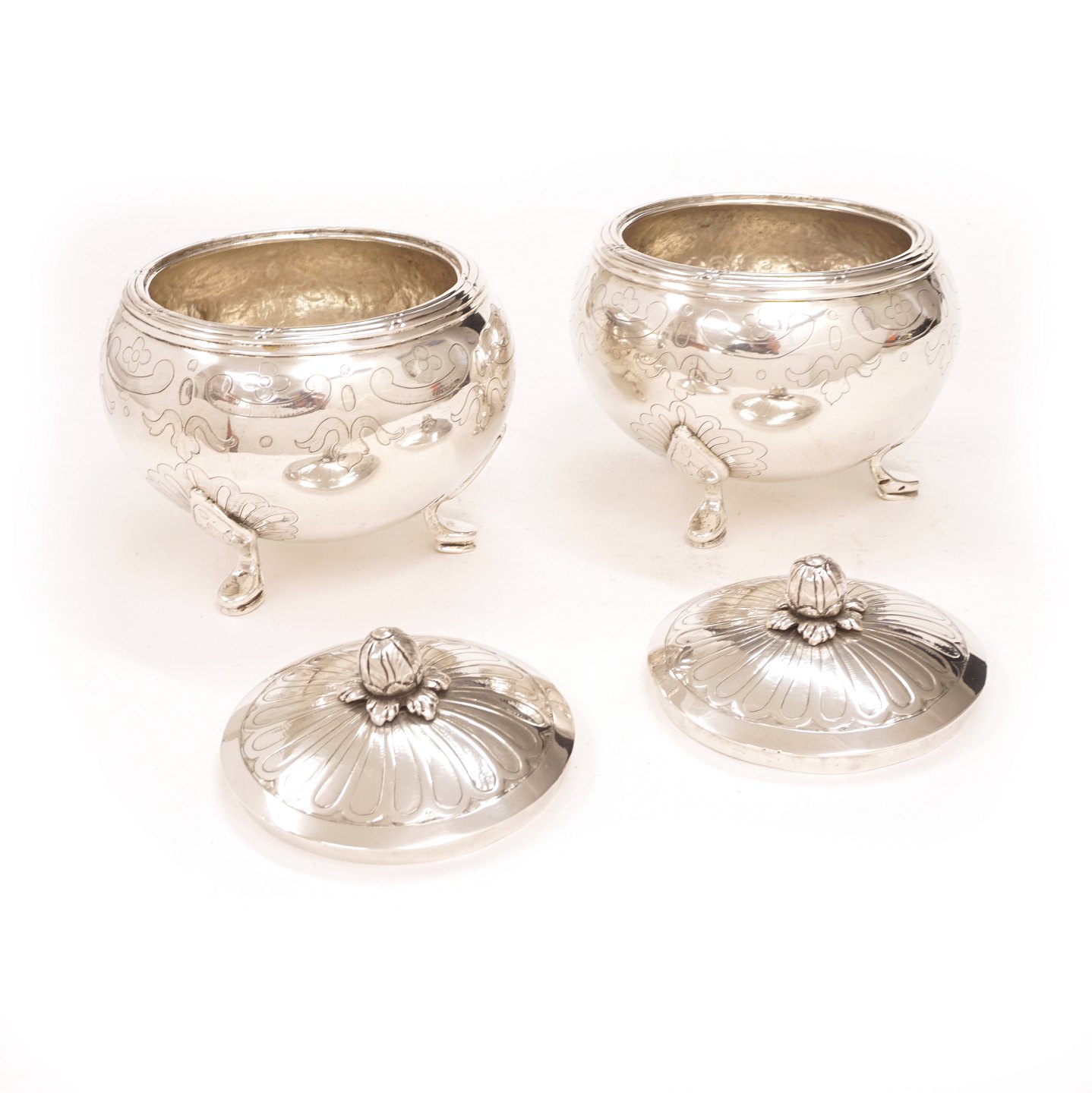 Bernt Christopher Kelberlade, Copenhagen, 1763-71: A pair of lidded silver sugar bowls. Dated 1770. H: 11cm. W: 706gr (both)