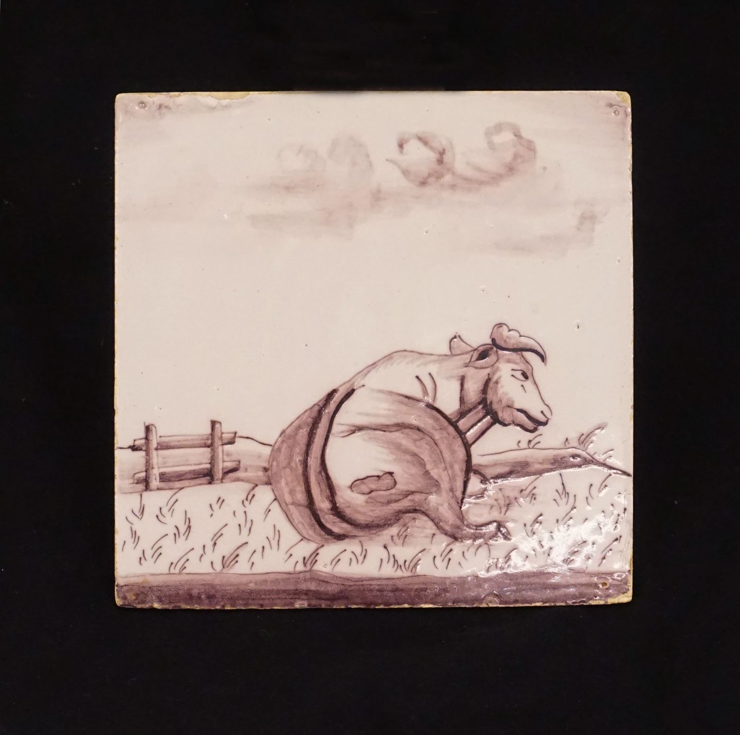 Mangan dekoreret flise med motiv i form af en ko. Holland ca. år 1800. Mål: 13x13cm