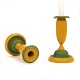 A pair of green and yellow decorated pair of candle sticks