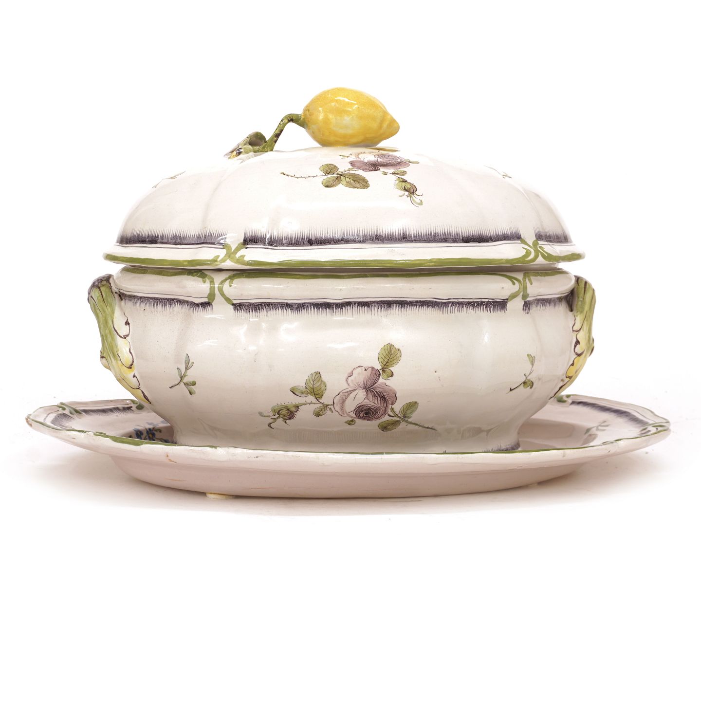 Polykrom dekoreret Stralsund terrin med underfad. Låggæk i form af citron. Fremstillet ca. år 1770. L fad: 41cm. H: 24cm