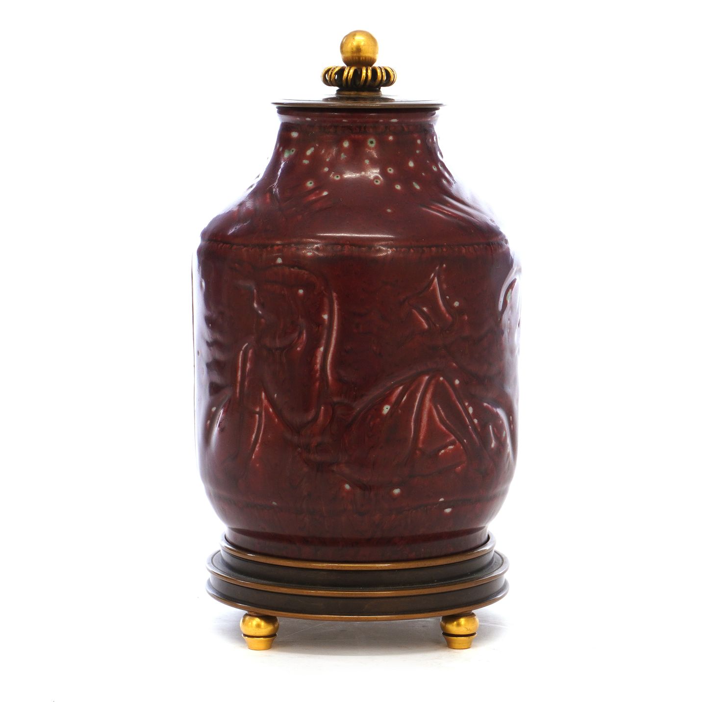 Jais Nielsen, 1885-1961, for Royal Copenhagen: Lågvase i okseblodsglasur med patineret og delvist forgyldt bronze standring og låg af Knud Andersen. Motiv "Jonas & Hvalen".