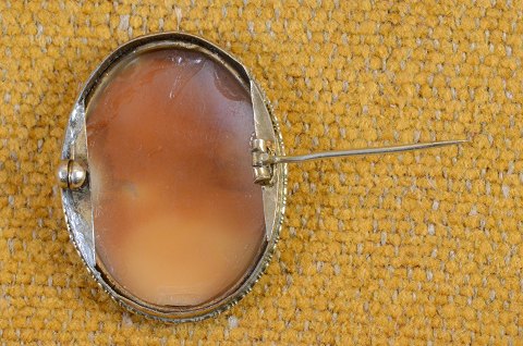 Camé romersk damehoved skåret fra konkylie, monteret i sølvramme omgivet af dekorationer. De smykker er en broche. Str.: 4,5 * 3,0 cm. Art No. 28