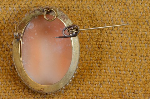 Camé, yndigt kvinde hoved udskåret af konkylie, monteret i forgyldt ramme omringet af mini perle. Smykket er både en broche og et vedhæng. Str.: 4,5 * 3,5 cm. Art.No.30