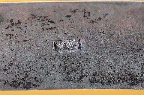 Skospænder sølv punslet mønster, monogram SCD, dateret 1845 og med sølvknopper i hvert hjørne. Dobbelt stemplet "WI" spænddelen er af jern. Str. 8,5 * 5,5 cm Art No.46