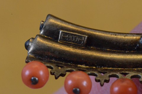 Hairpin of horn with corals in 2 curved rows, beautifully carved silver frame featuring 10 major coral beads. Size: 6,5*1,8 cm, legs 7 cm. Art.No. 103