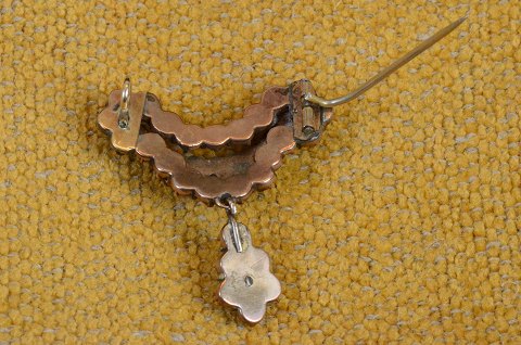 Granat broche med vedhæng. Rosen slebet granater dekoreret med seed pearls. Str.: 3 * 1,5 cm vedhæng 1 cm. Art No.: 105
