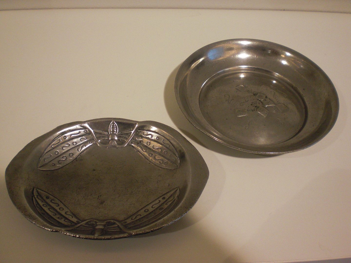 Trevleskål og askeskål i tin fra Mogens Ballins værksted. Trevleskålen til højre er afbildet i Vejen bogen 186 - formentlig af Sigfried Wagner. Stemplet MB T 28. Diameter: 12 cm - højde: 2 cm