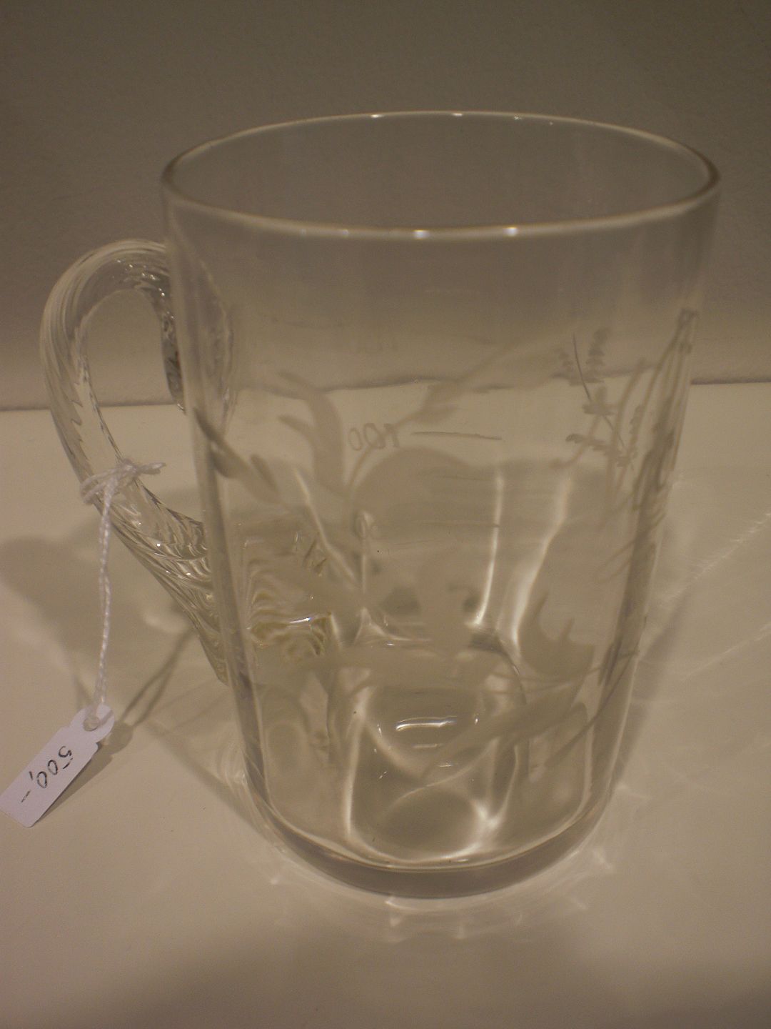Fransk kurglas fra Vichy-kilden med med drejet hank. Dekoreret med matsleben dekoration og mængdemål. I meget fin stand fra ca. 1880.