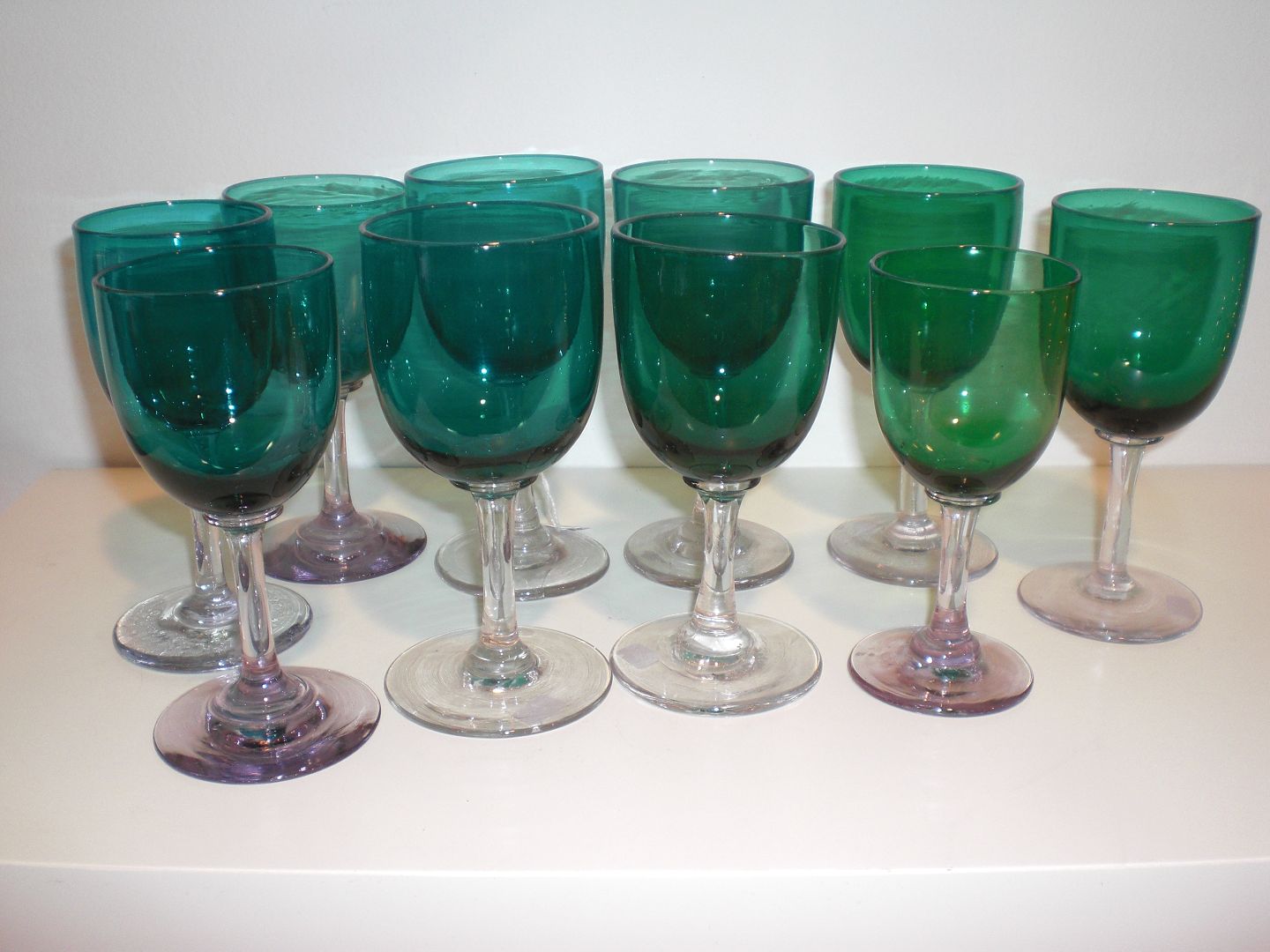 10 engelske grønne Bristol hvidvinsglas 1830-1840. Bristol husede et stor antal glaspusterier helt tilbage fra 1740. Det mest kendte er Bristol Blue som stadig eksisterer i dag. Denne glastype blev fremstillet på flere værksteder og bredte sig også til Frankrig. Højde: 12,5 - 13 cm. Kan sælges enkeltvis til 400 kr. pr. stk. 4 stk. er solgt.