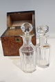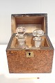 Lille foret skin i fugleøjetræ med messing ved nøglehul og som skjold på låg. Nøgle mangler. Indeholder to miniature karafler med glasproppe - ikke ens og formentlig den ene ikke original til skrinet. Lille skår i kraven på begge karafler. Mål: 12,5 x 11 x 6,4 cm.