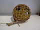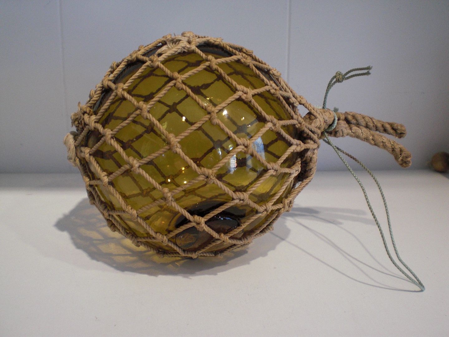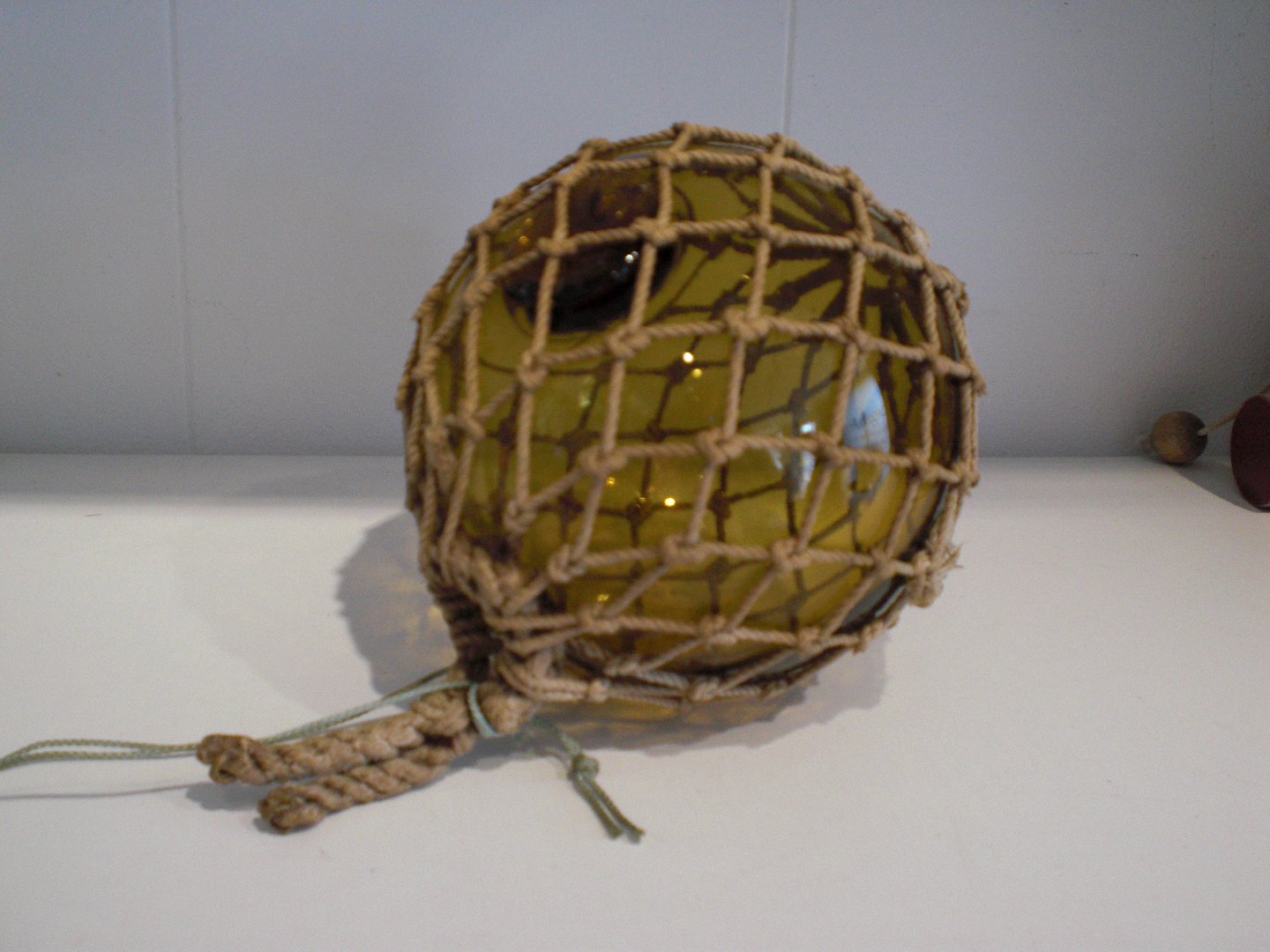 Mundblæst gulbrun fiskekugle i originalt tovværk. Diameter med tovværk: 11,7 cm.