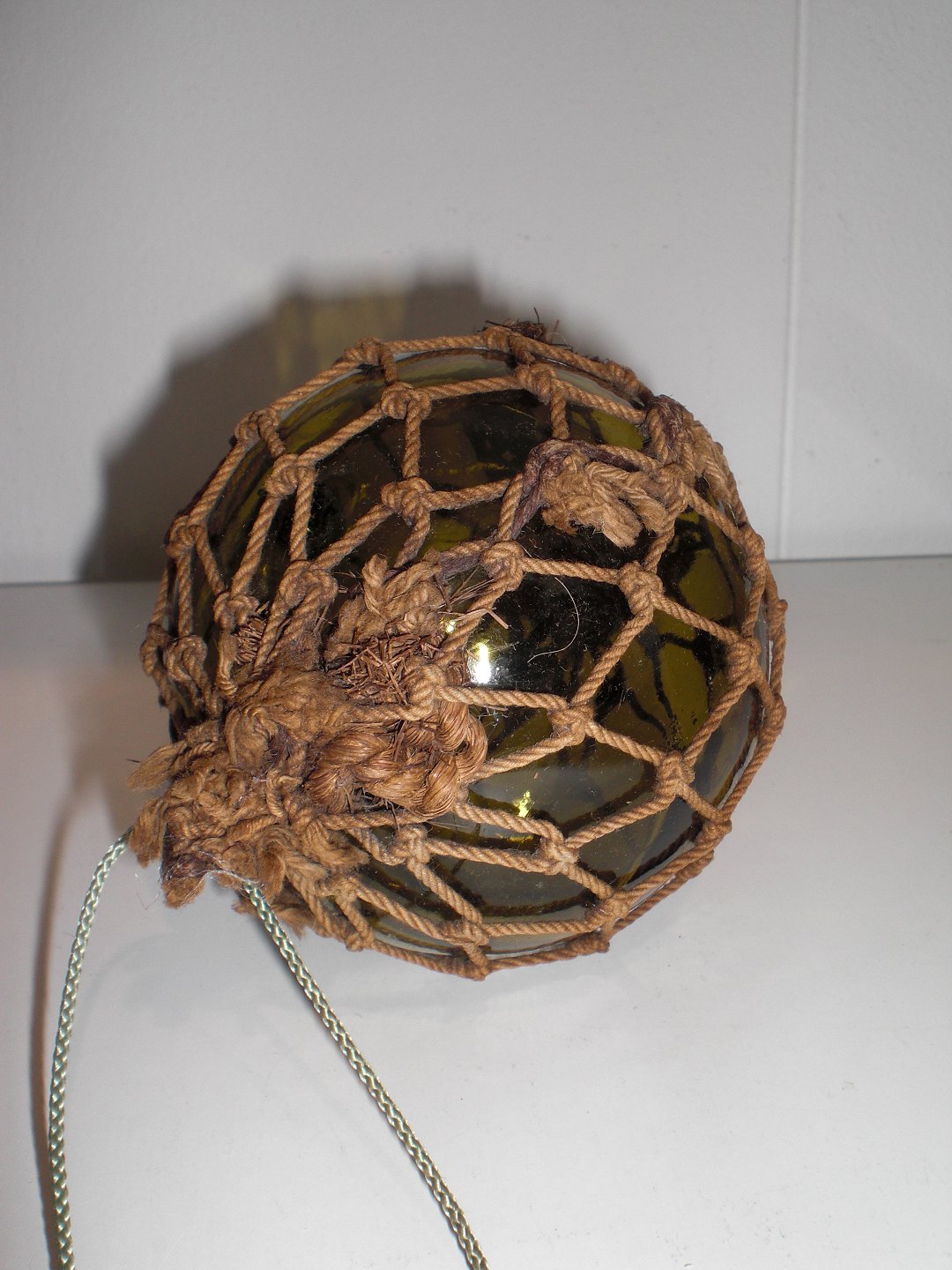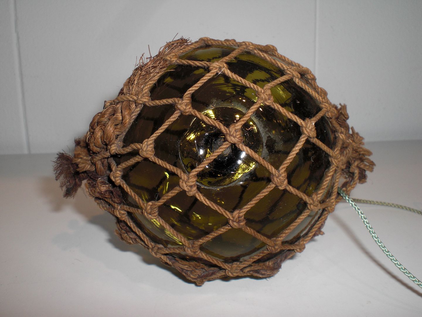 Usædvanlig lille mundblæst grøn fiskekugle i originalt tovværk. Diameter med tovværk: 7,9 cm.