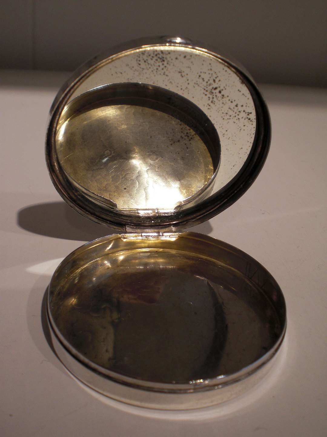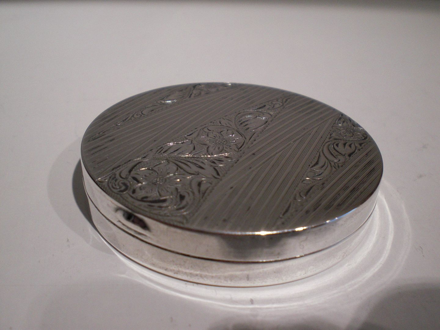 Flad, rund sølvæske med indre spejl (lille pudderæske?). Med cisilleret låg udført af Hugo Grün (1918 -1937) udført i 1927. Højde: 1,3 cm. Diameter: 5,9 cm.