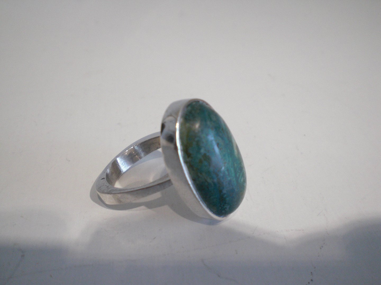 Oval sølvring (testet) med carbochonsleben Amazonit. Mål på sten: længde: 2,2 cm. - bredde: 1,4 cm. Ringstørrelse: 57. I fin stand