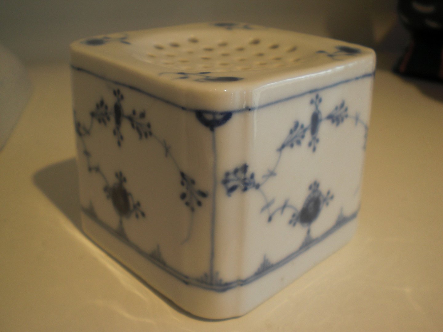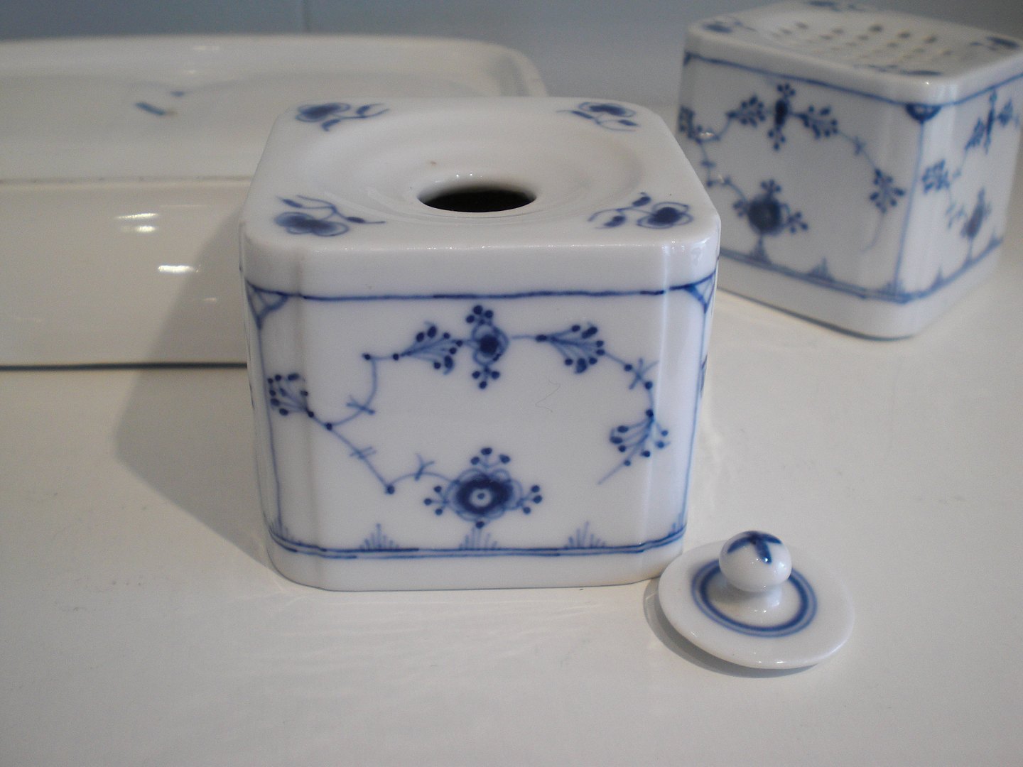 Kgl. Porcelæn musselmalet riflet skrivesæt med løse dele. Blækhus med det lille låg indtakt og sanddåse. Tidligt stempel 1850 - 1870. 1. sortering. Fin stand. Længde: 22 cm. Bredde: 15,5 cm. Højde: Højde: 7,7 cm.