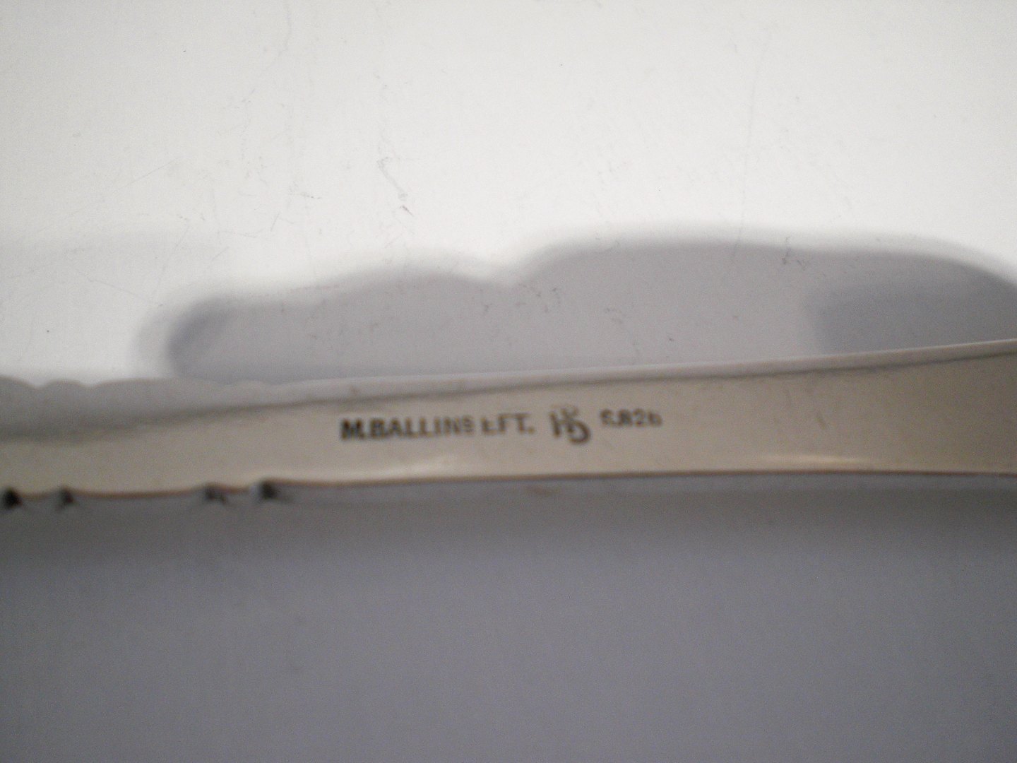 Mogens Ballins Eftf. skønvirke serveringspade i 826s sølv med gennembrudt laf og håndtag isat en grøn/blå halvædelsten. Stemplet " Mogens Ballins Eftf. HB 826s". Ca. 1910. Længde: 28 cm. Vægt: 98 gram. I fin stand med meget let brugsslid. Ikke medtaget i Vejen Bogen.