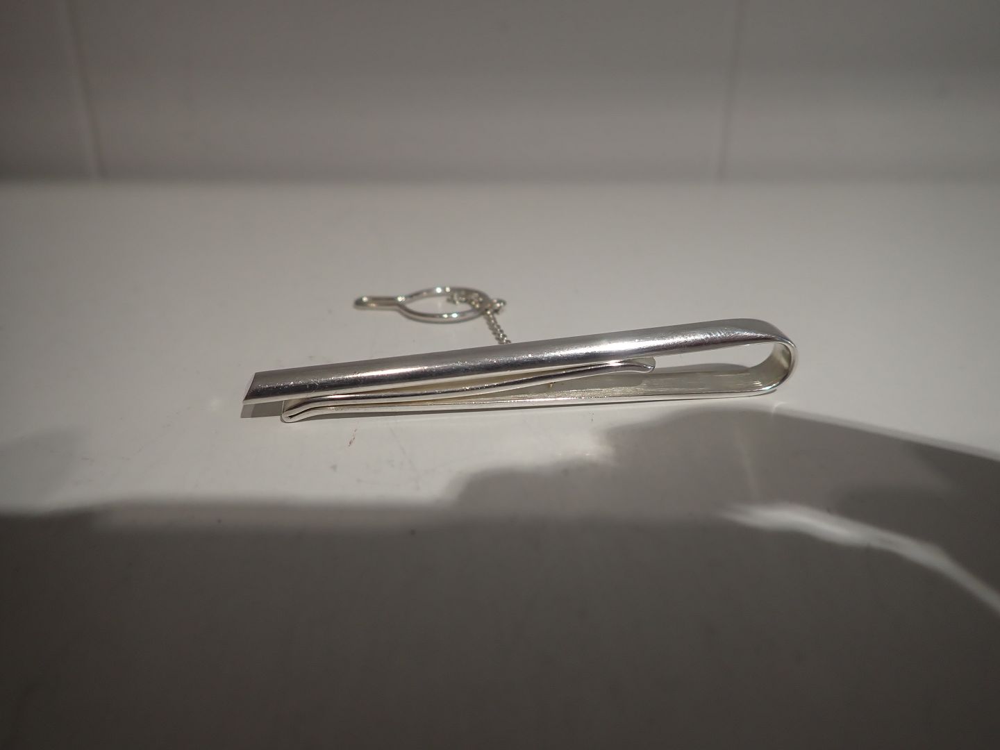 Sølvsmedien (1993 -2001), Kolding - glat slipsenål med sikkerhedskæde i sterling sølv, stemplet Sølvsmedien, 925, Denmark. Mål: 7 x 0,5 cm. Vægt. 11,6 gram