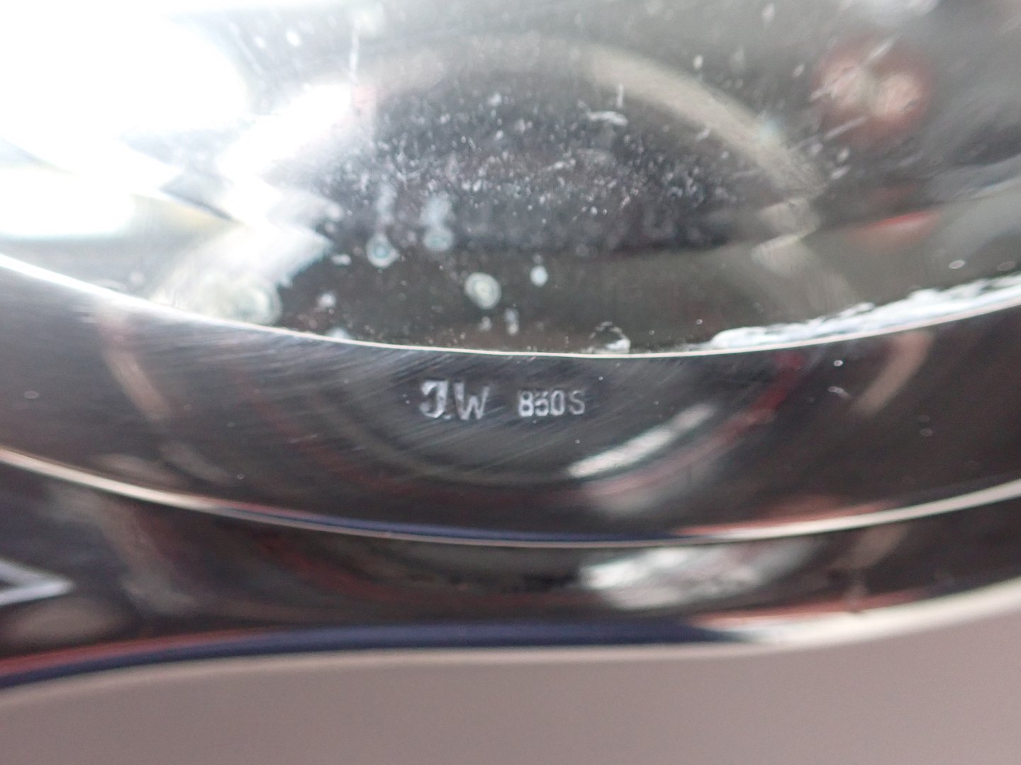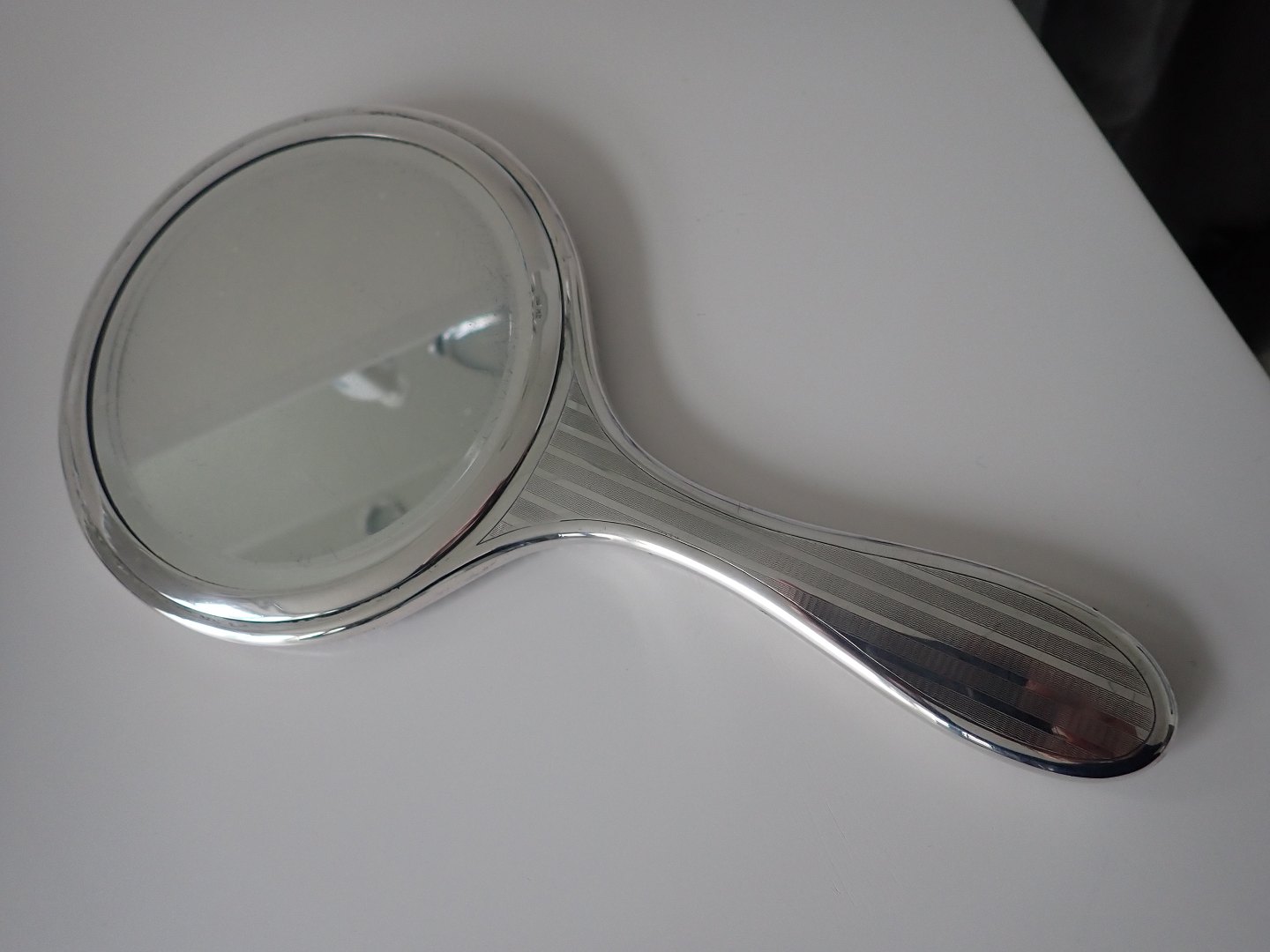 Joseph Warisch, Kbh. ( 1937 - 1948) - Håndspejl i 830 sølv med stribet, graveret dekoration og perlekant. Originalt spejlglas med sleben kant. Stemplet J.W., 830 S. Længde: 26,8 cm. Bredde: 14,5 cm. Pæn stand med tidsvarende brugsslid.