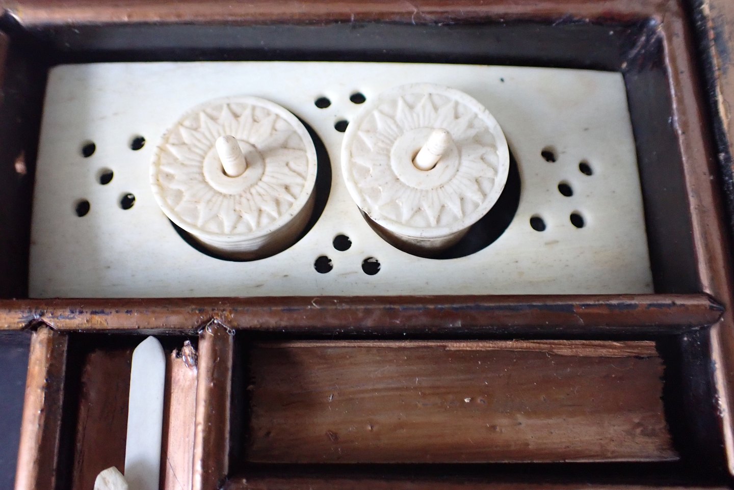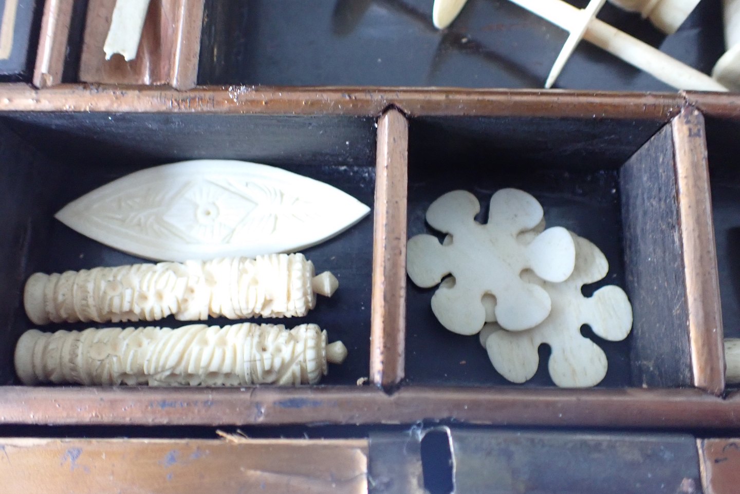 Kinesisk - Canton syskrin i lakeret træ med chinoise dekoration og løvefødder fra slut 1800-tallet. Indeholder bakke med flere rum, to med dekorerede låg. Derudover indeholder skrinet omkring 18 små syting i udskåret elfenben og ben (f.eks. Nålehylstre, garntrisser, skruetvinge). Sælges samlet. Skrinets højde: 12 cm, længde: 29 cm og bredde: 21 cm. Selve skrinet er solbleget udvendigt og en del slidt og med afslag både indvendig og udvendig.