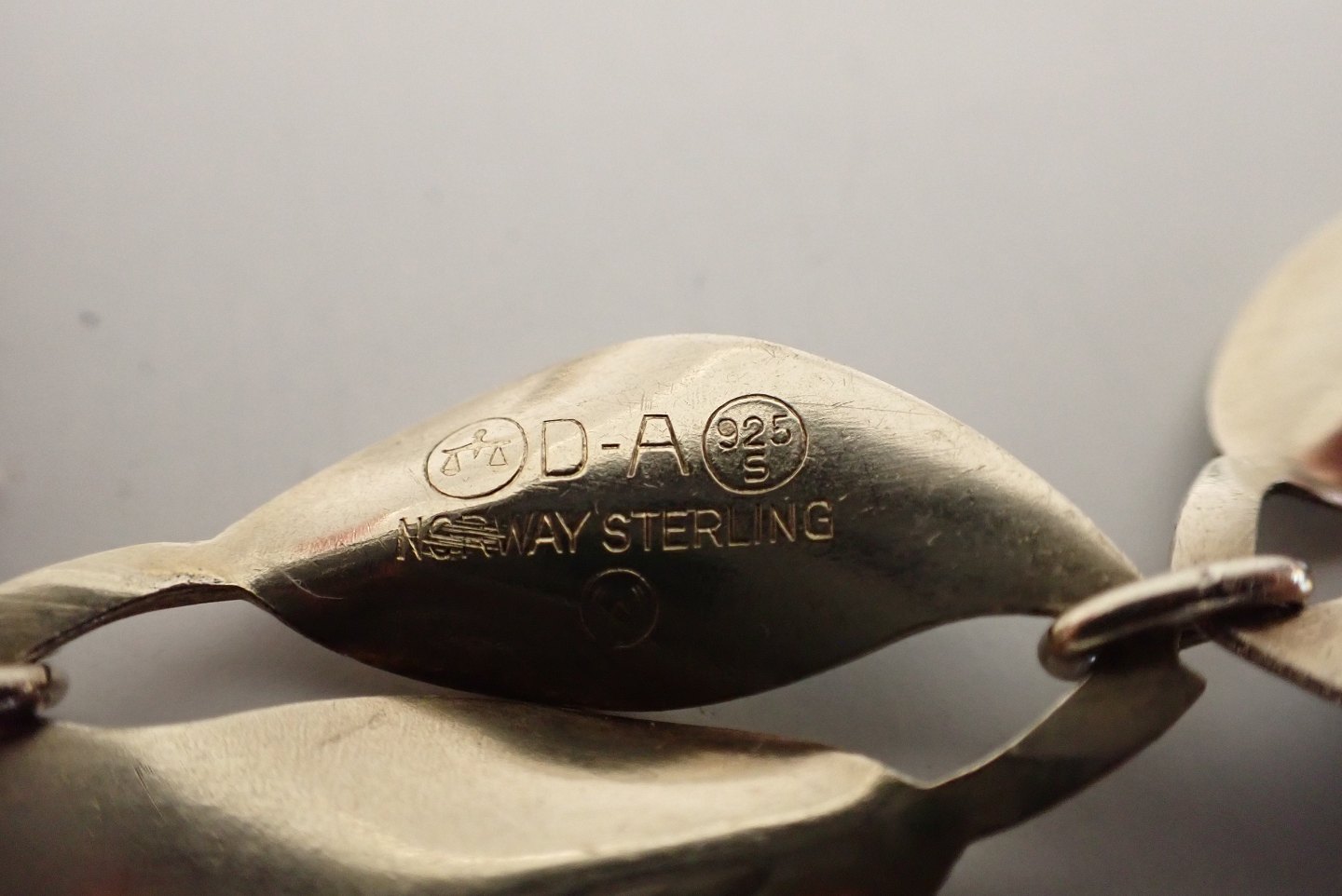 David Andersen (1880 - 1980), forgyldt, sterling sølv halskæde og øreklips med grå emalje på guilliocheret arbejde. Designet af Willy Winnanaess i 1950-erne. Stempler: Vægt i cirkel, D-A, 925s, Norway Sterling, W i cirkel. Kæden er en dobbelt række af blade. Længde på halskæde: 39 cm. Samlet vægt: 48,6 gram. I fin stand uden emaljebeskadigelser. Sælges kun samlet.