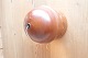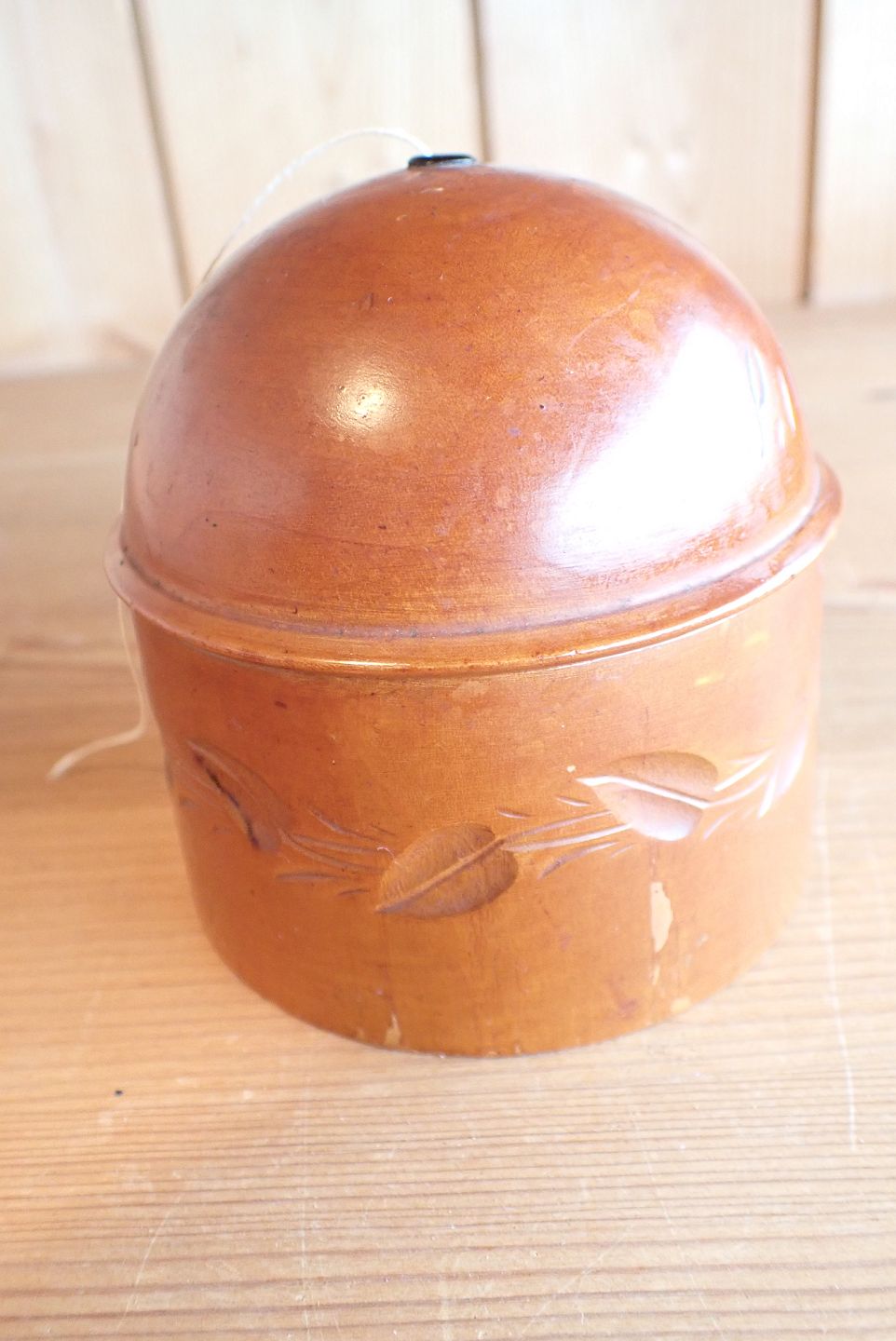 Rund og kuppelformet trææske til tråd og snor. Hul i låget med indlæg af sort metal, hvor tråden kan komme ud. Lakeret bøgetræ med udskæringer i form af bladranker. Højde: 8,7 cm, diameter: 8,3 cm. . I pæn stand med ganske lidt lakafskalning.