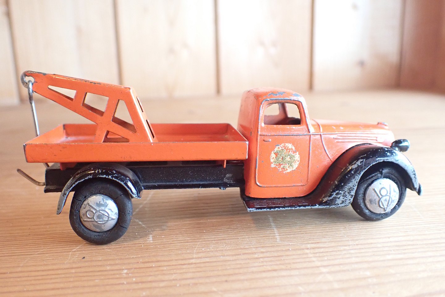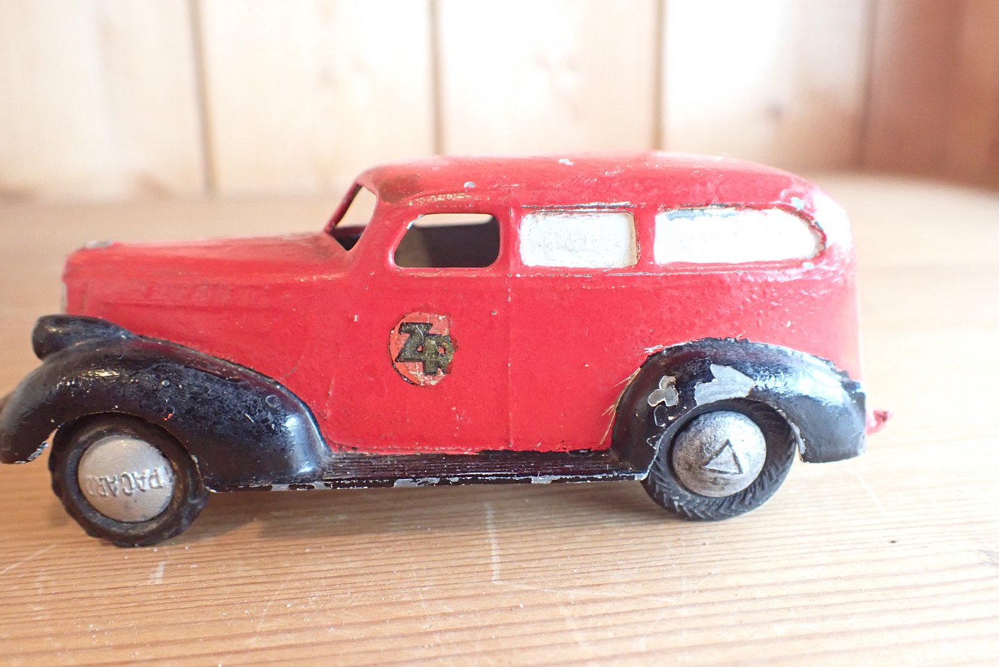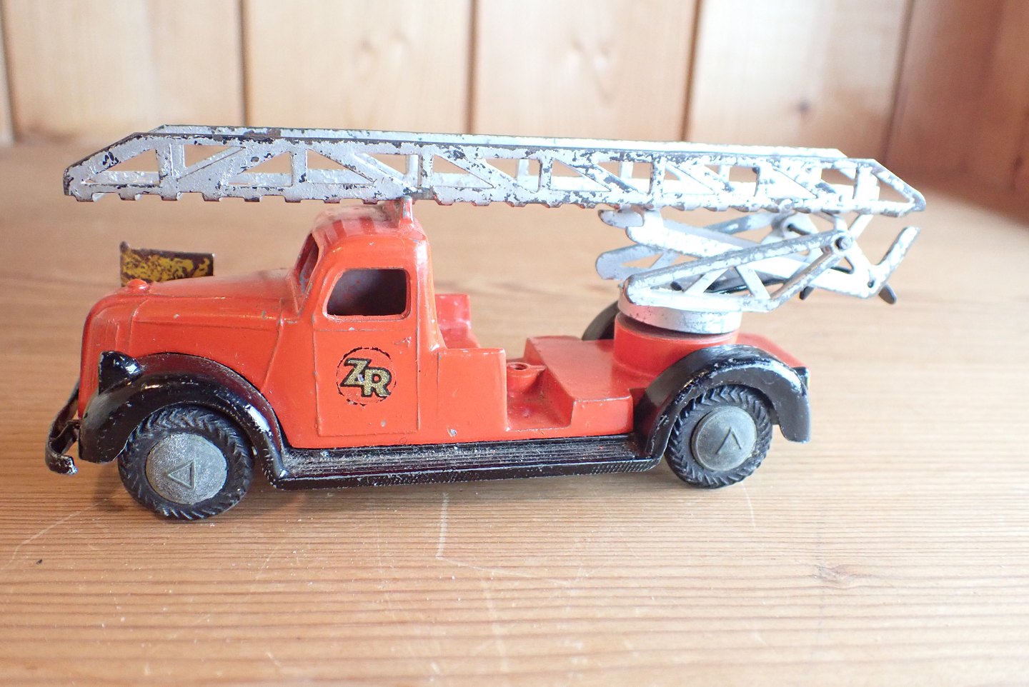 3 Tekno biler med Zonen Redningskorps (ZR) (Dansk Legetøjs Industri 1928 - 2009) Stigebil pris: 500 kr., kran med et udskiftet for lille dæk og en manglende hjulkapsel Pris: 350 kr. Ambulance - måske overmalet pris: 350 kr. Længder 13 henholdsvis 13 cm.,11,5 cm. og 10,3 cm. mærket med Zonen Redningskorps og flag. Ca. 1950. alle i noget slidt stand