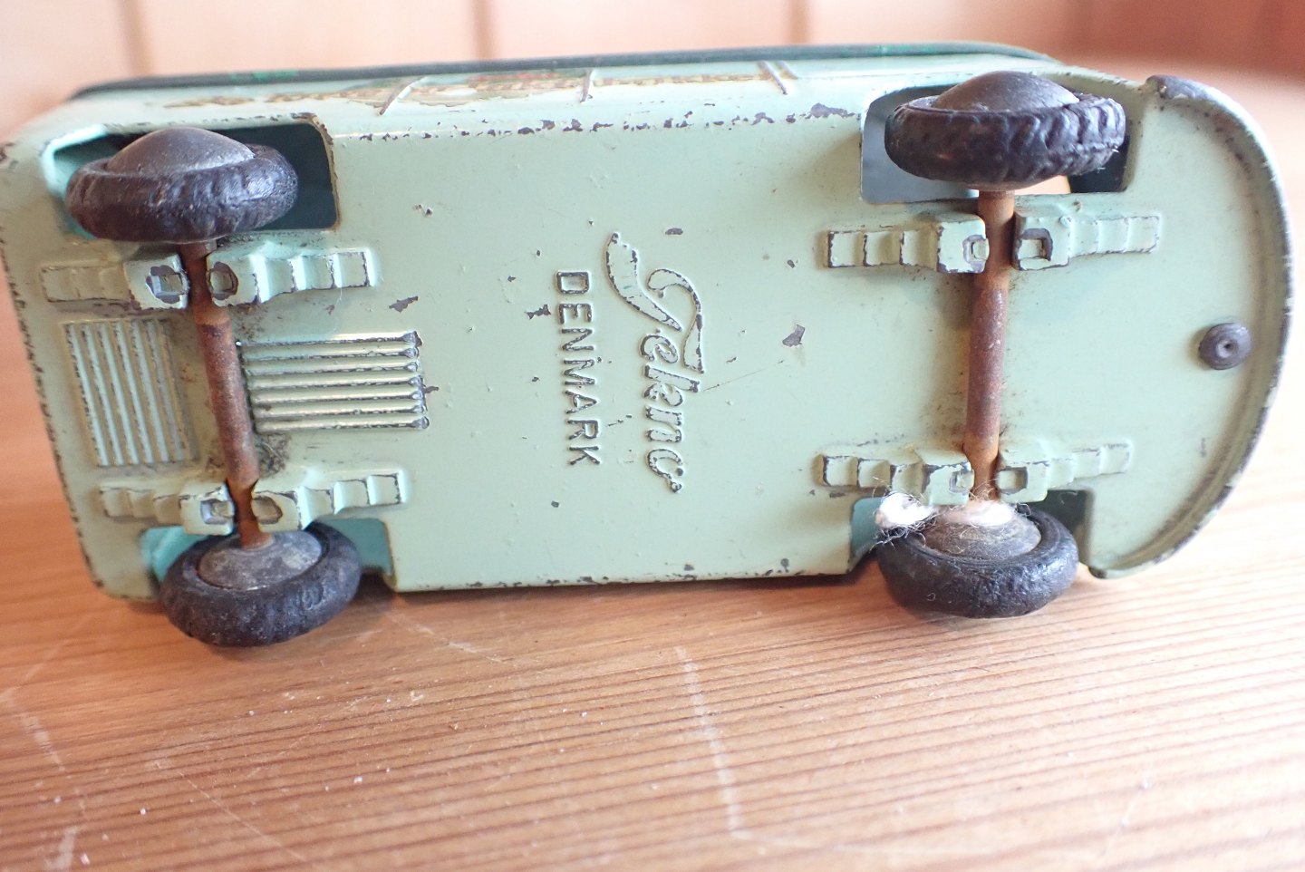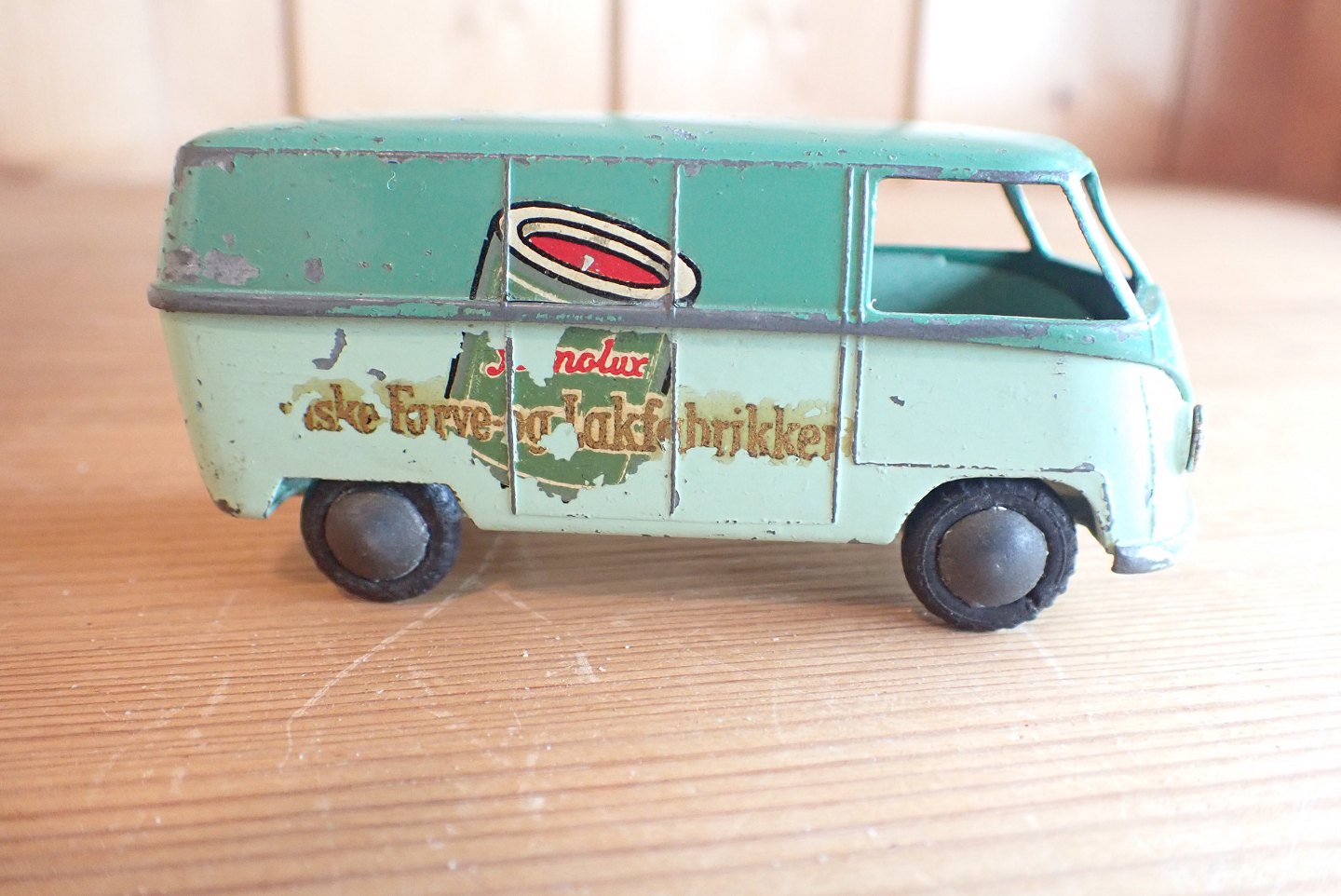 Tekno (Dansk Legetøjs Industri 1928 - 2009) VW 1, Folkevognsrugbrød med reklame for Danske Farve & Lakfabrikker med malerdåse mærket Primolux. Bilen er i pæn, men let slidt stand. Længde:13 cm.
